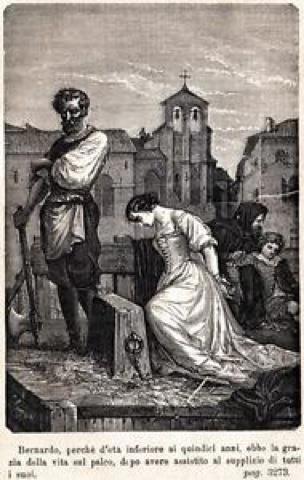 В это время осужденные приблизились к часовне, где они долго еще молились перед принятием святого причащения. Наконец, братство мизерикордии со своим распятием покрытым черным флером, пришли за Бернардино. Бедный ребенок отправился за ними ни жив, ни мертв и, когда ему велели взойти на эшафот, он воскликнул с отчаянием: «Боже! Боже! сколько же раз мне умирать еще? Вы мне два раза обещали жизнь и два раза обманули меня! Боже! что же это за мученье такое!»
