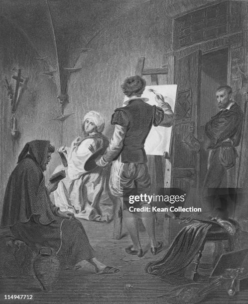 Она встала, пала на колени перед образом Матери всех скорбящих и горячо молилась. Обе женщины последовали её примеру. Они еще не кончили молитвы, когда в тюрьму вошел помощник палача с бритвою в руках. Холод пробежал по телу Беатриче, когда она увидела этого человека, но она тотчас же успокоилась и, обращаясь к нему, сказала: