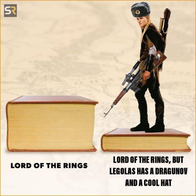 или Власелин колец в котором у Леголаса есть винтовка Драгунова и крутая ушанка.
