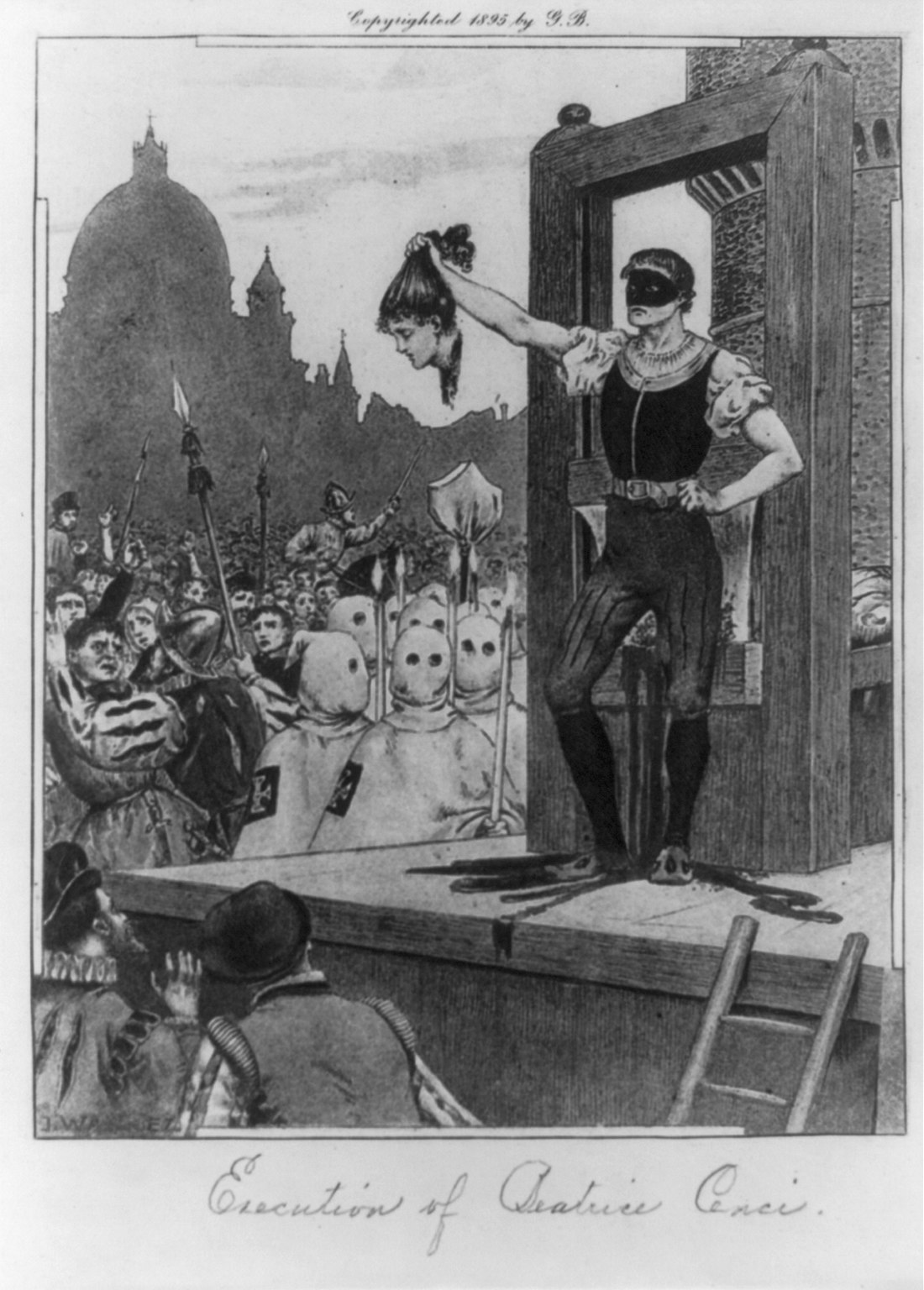 Синьора Лукреция, отличавшаяся менее твердым характером, почти все время плакала. Юная Беатриче, напротив, вела себя мужественно: перед каждой церковью, мимо которой проходила процессия, она опускалась на колени и, устремив на нее взор, твердым голосом говорила: «Adoramus te, Christe!»