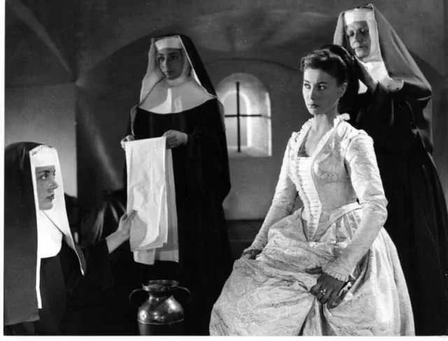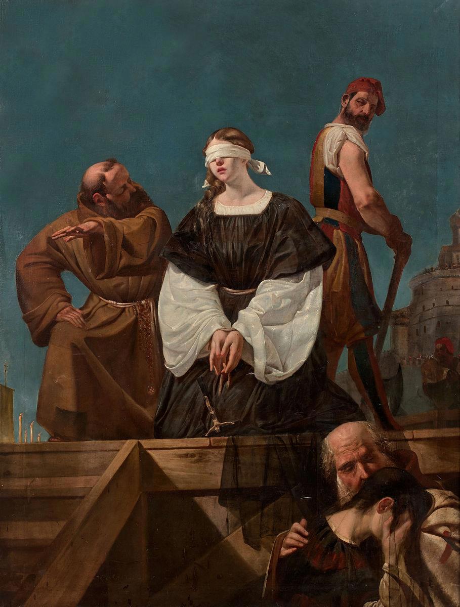 В восемь часов они исповедались, прослушали мессу и причастились. Но, прежде чем пойти к мессе, Беатриче подумала, что будет нехорошо, если она взойдет на эшафот перед всем народом в богатой одежде, которая была на ней. Она велела принести два платья: одно для себя, другое для мачехи. Они были такие же, как у монахинь, без украшений на груди и на плечах, со складками и широкими рукавами. Платье мачехи было из черной материи, платье молодой девушки — из голубой тафты, с толстой веревкой вместо пояса.