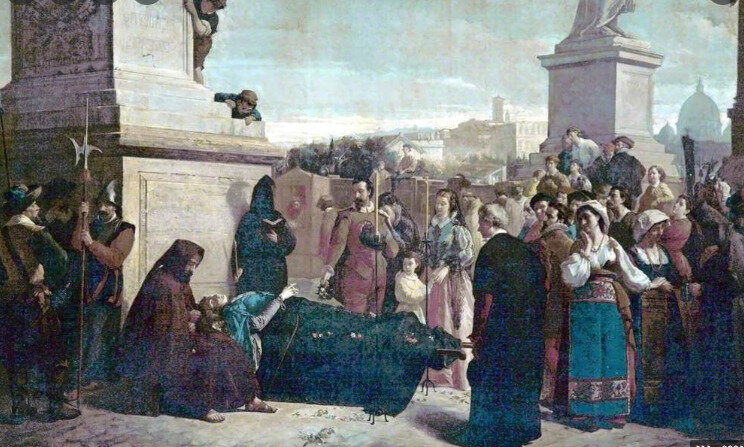Лукрецию Петрони в десять часов вечера отнесли в церковь св. Георгия. При всей этой трагедии присутствовала огромная толпа; насколько видно было глазу, все улицы были запружены каретами и людьми; крыши домов, окна и помосты были усеяны любопытными. Солнце жгло в этот день так немилосердно, что многим становилось дурно. Множество людей заболело лихорадкой. Когда же в девятнадцать часов (без четверти два) все кончилось и толпа стала расходиться, на площади осталось много задавленных и затоптанных лошадьми. Вообще в этот день погибло немало людей.