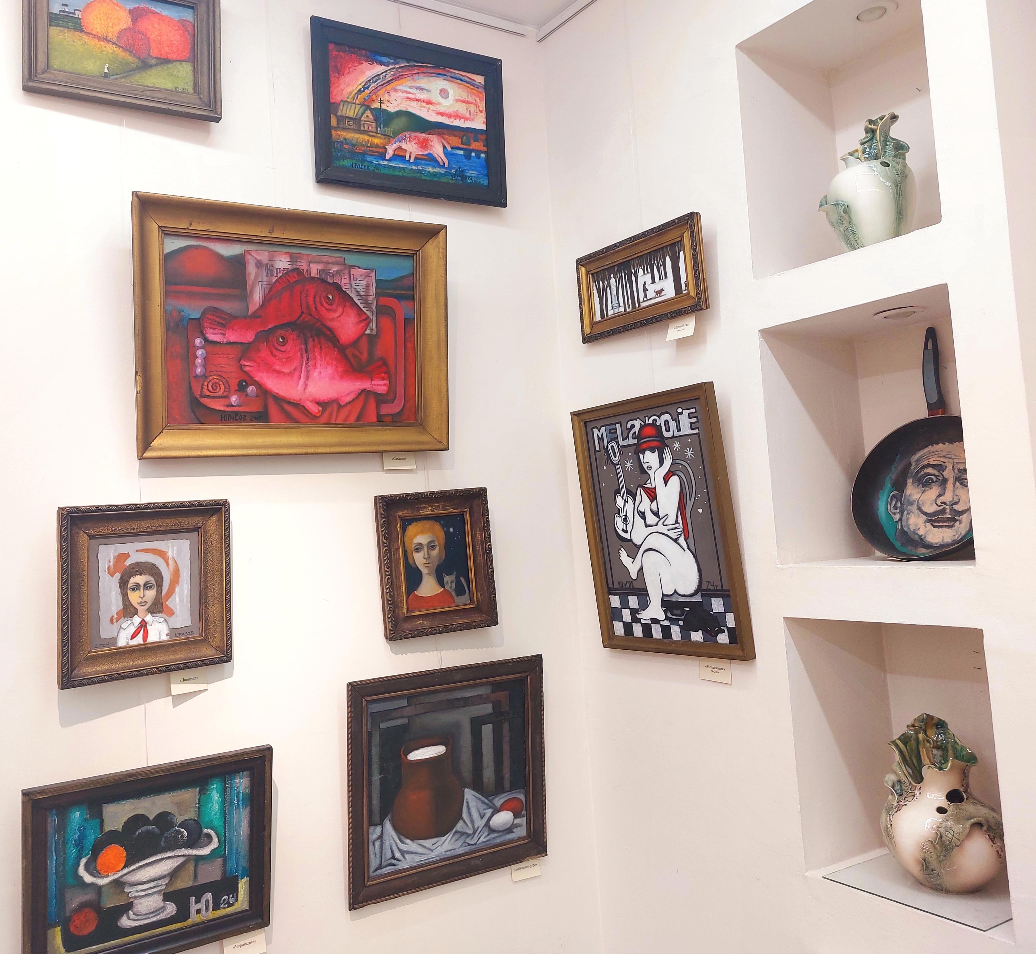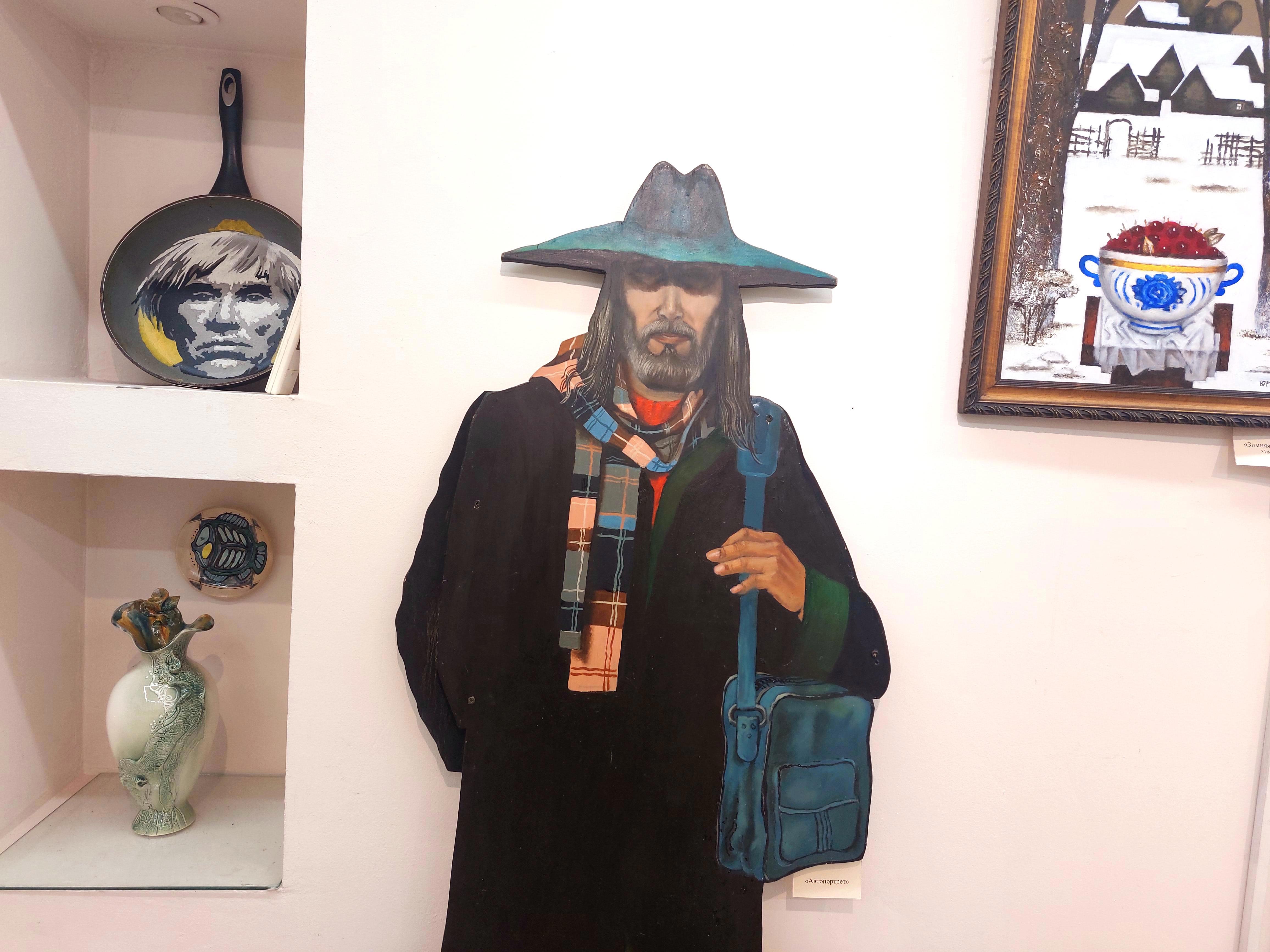 😊💟Напротив входа посетителей выставки встречает фигура художника, словно вырезанная из нарисованного мира, а на подоконнике стоит плоский силуэт вазы с цветами… Эти инсталляции как бы объединяют оба мира вдохновенного творца: нарисованный и настоящий.