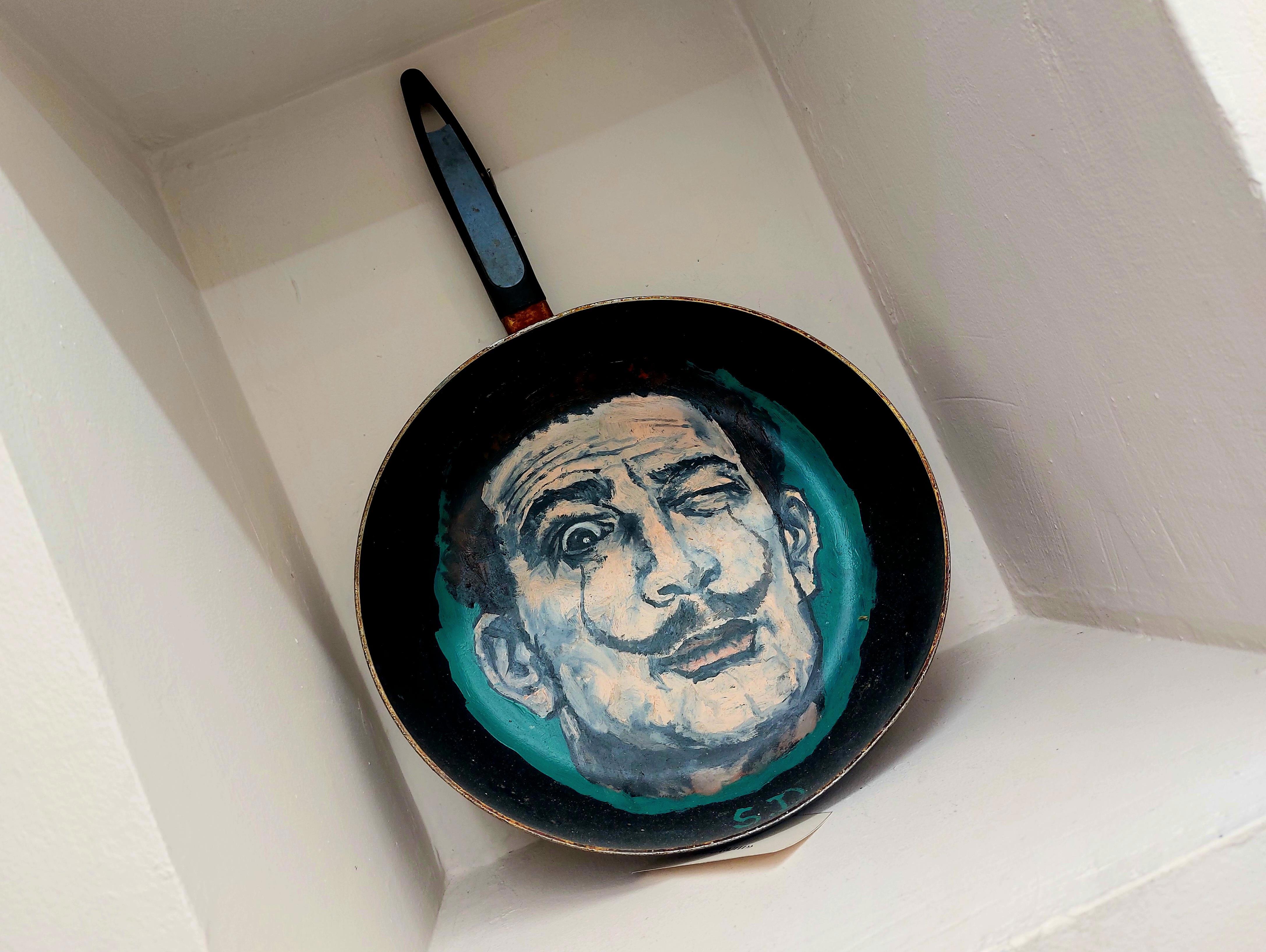 Например, узнаваемое лицо Сальвадора Дали с его неизменными усами-стрЕлками, написано на дне сковородки, но ведь этот творец любил удивлять, смешивая обычное с невероятным…