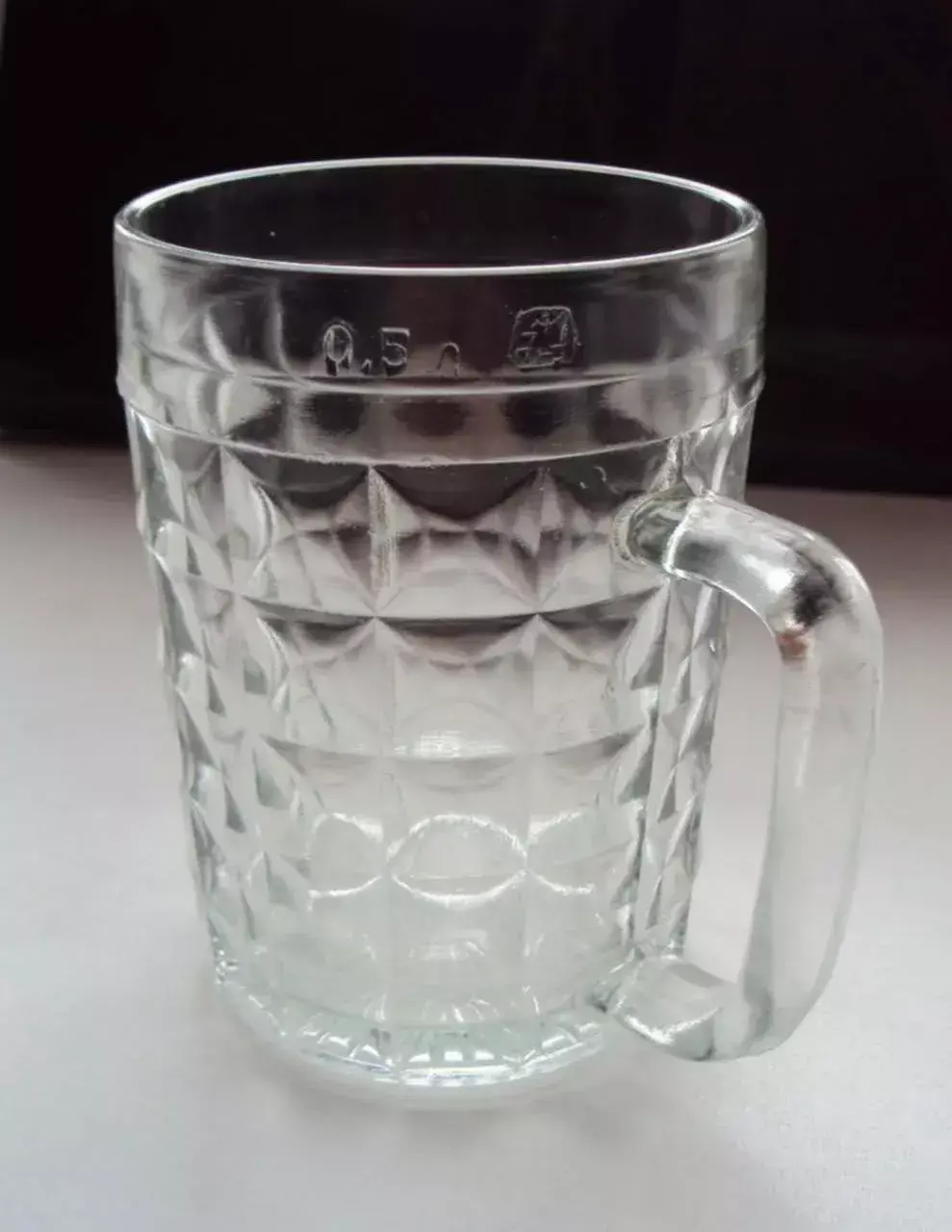 Начнём с представителя сталинского ампира. Витые грани, по центру геральдический щит, ручка под два пальца, без шва от литья с удобной гладкой выемкой под большой палец. Как по мне, так кружка для людей. Конкретно этот образце вроде бы сделан для одной из прибалтийских республик (нет клейма и отметок завода, что снижает коллекционную стоимость, а ещё объём обозначен как 0,5L, при том что обычно шло 0,5л)