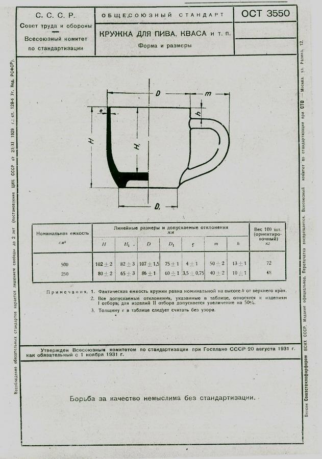Итак, история эта началась аж в 1918/27 году, когда был окончательно определён объём кружек для пива и кваса в 0,5 и 0,25 литра. Речь, само собой, о вновь выпускаемой продукции. А в 1931 году увидел свет ОСТ, заложенный в котором форм-фактор просуществовал в массовом производстве аж до 1969 года или даже чуть позже. А что потом? А потом взошла звезда Уршельской "барной" кружки, но об этом немного позже.