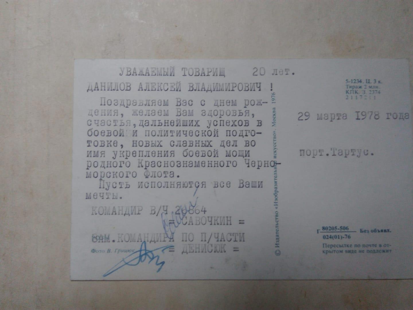 Поздравительная открытка с днём рождения от командования корабля, который выполнял миротворческую миссию в сирийском порту Тартус. Боевая служба, у меня их было три.