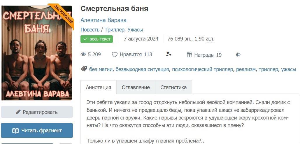 Эта небольшая повесть в жанре триллер рассказывает о жуткой ситуации, в которой оказалась компания друзей, снявшая на выходные загородный домик с банькой.
