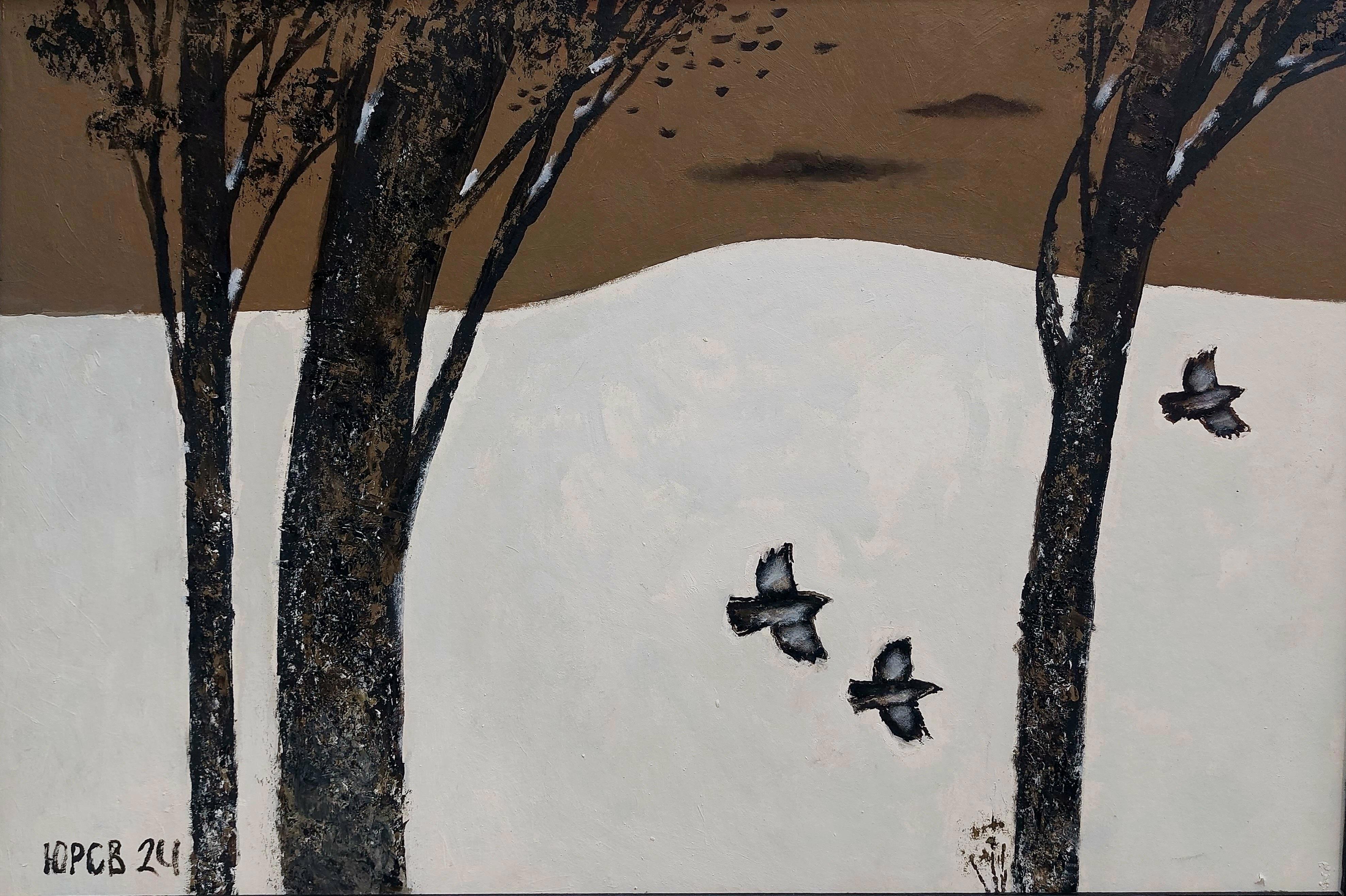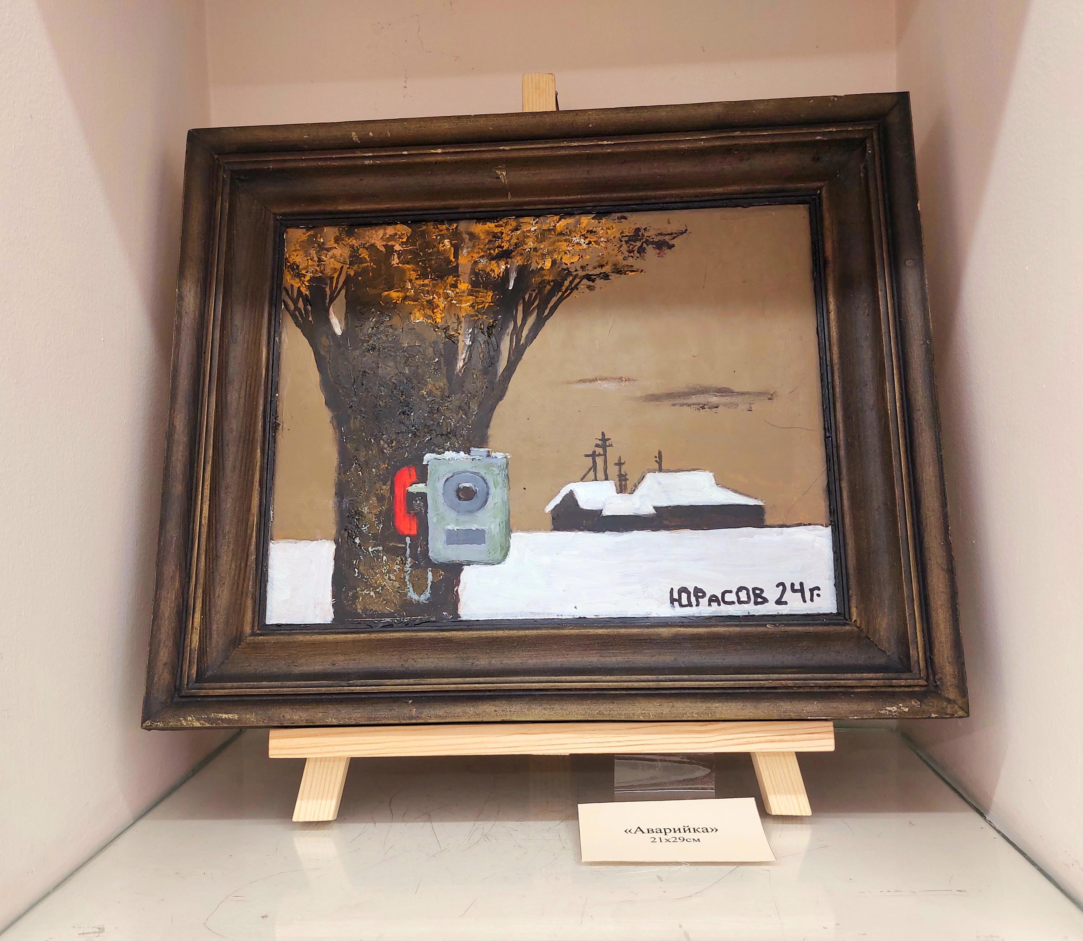 Простые, казалось, бы деревья, птицы, дома, столбы и даже старый телефон-автомат на полотнах Юрасова поднимаются до образов-символов.