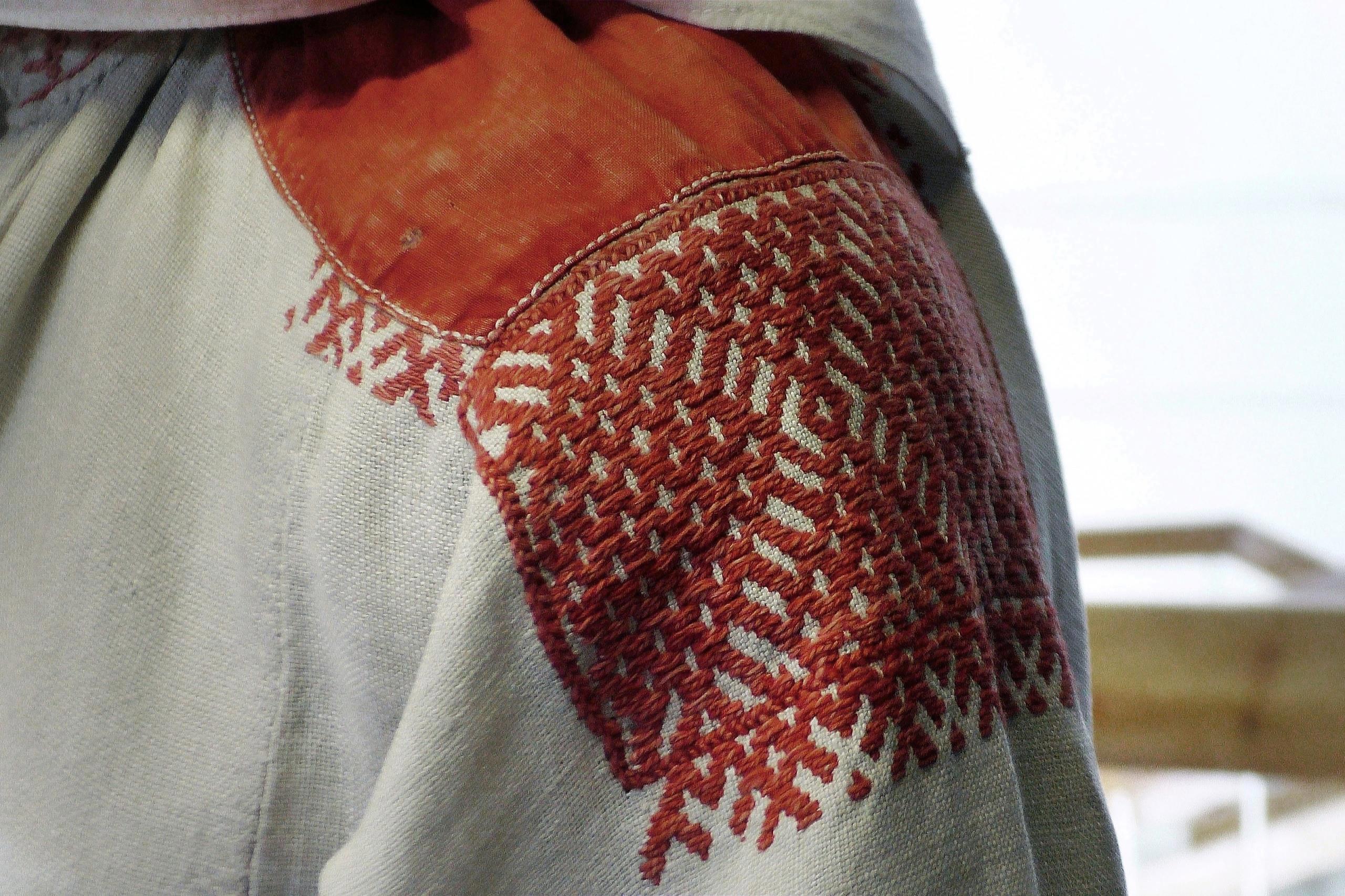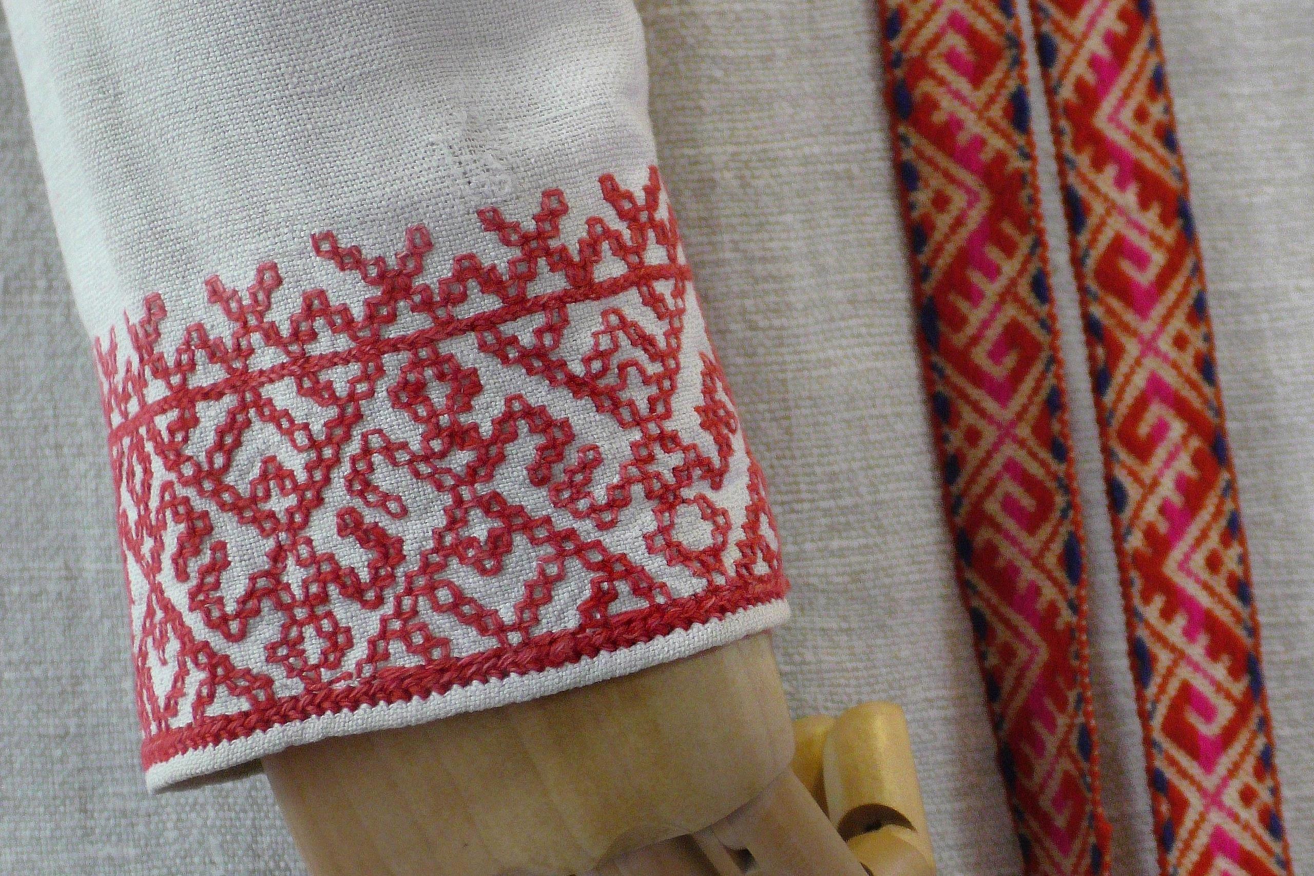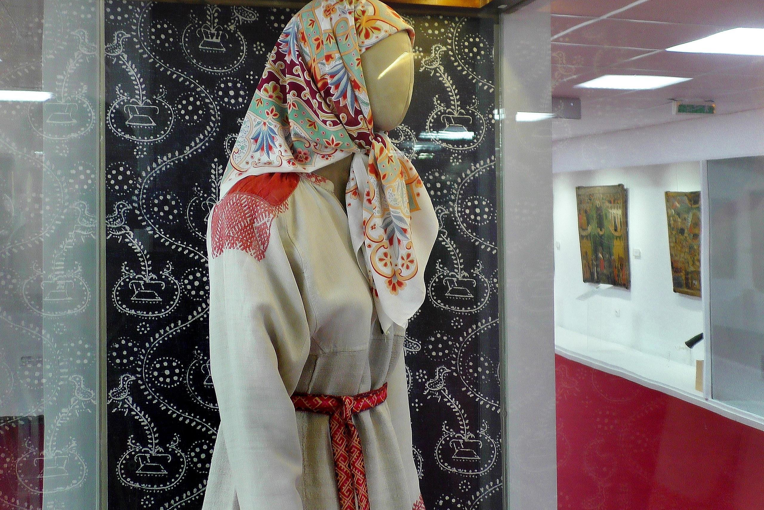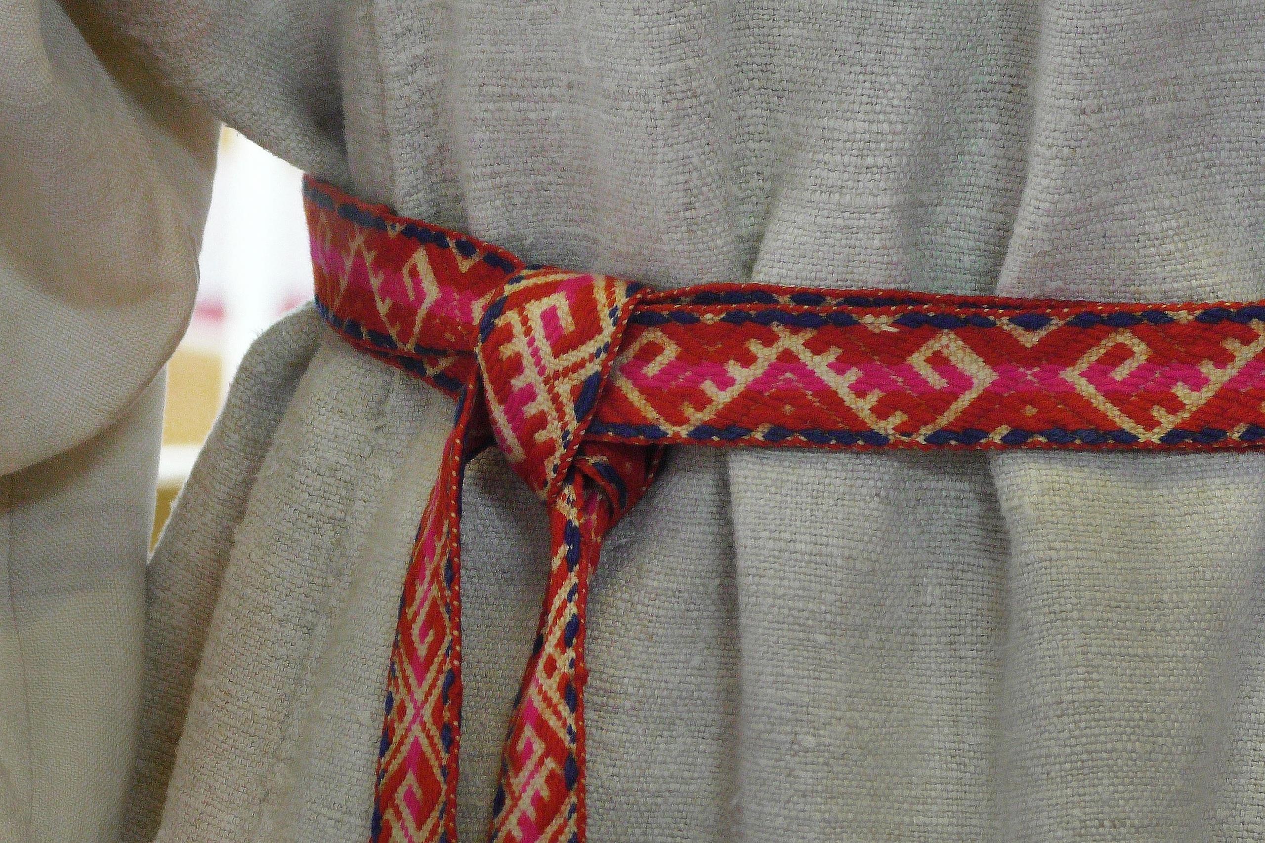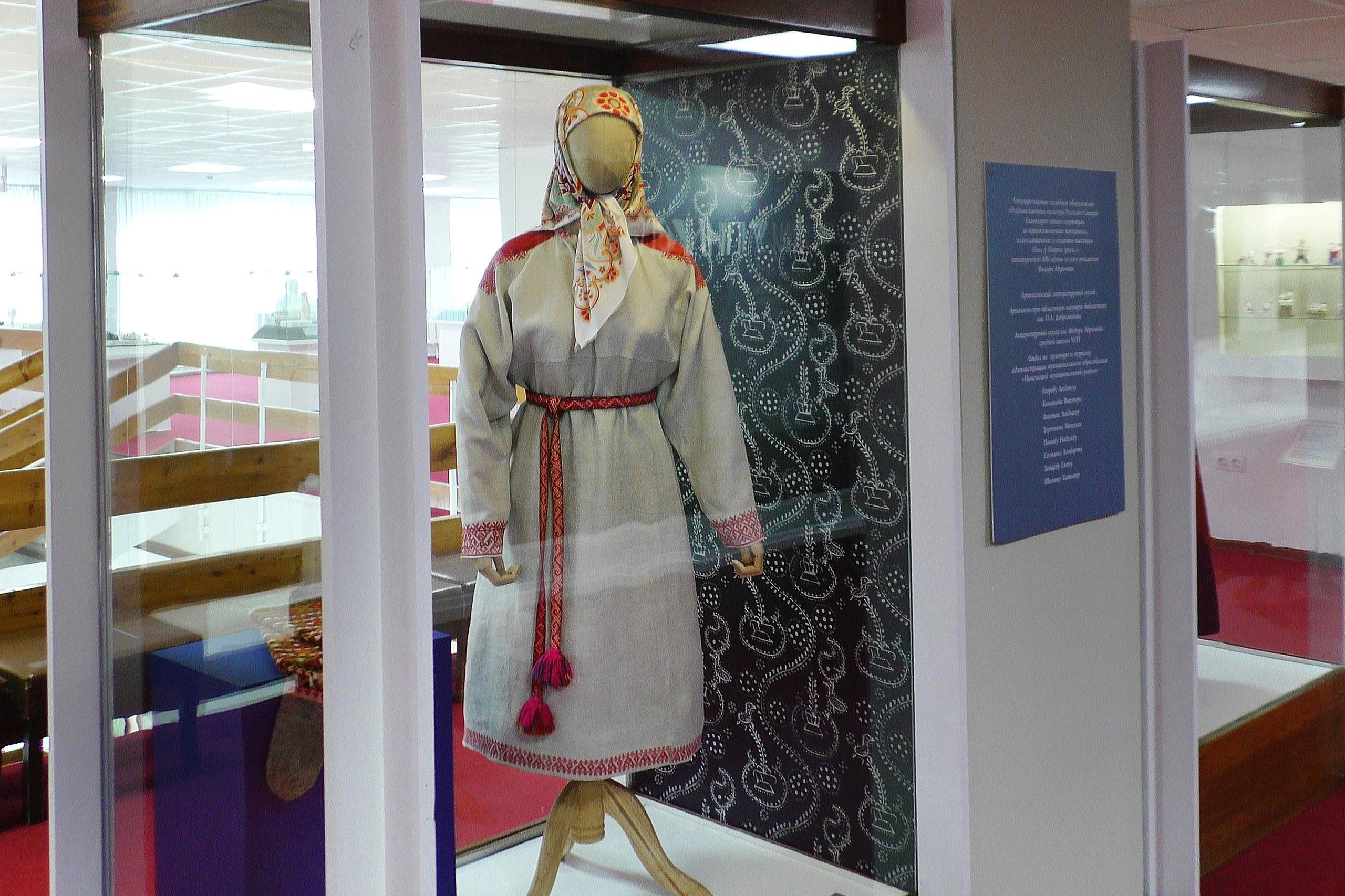 Костюм рубежа 19 и 20 веков, состоит из "рубахи-рыболовки", пояса и платка. Найден в Никитинской волости.