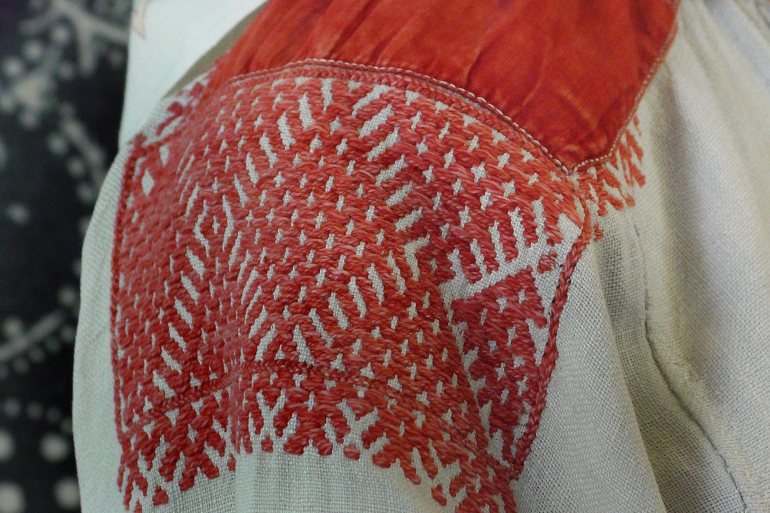 Описание от Л. Ф. Кислухи "Составная, сшита из двух частей. Верхняя часть («рукава») — из тонкого льняного полотна. Воротник в виде невысокой стойки, по центру груди — прямой разрез. Рукава длинные, на плечах прямые вставки-полики из кумача. Под мышками вшиты квадратные вставки-ластовицы. Воротник, оплечья и запястья рукавов украшены красным вышитым узором: на воротнике — зигзагообразные линии, на оплечьях — решетчатые ромбы, на запястьях — узор из человеческих фигурок, расположенных в ряд, вверх и вниз головой поочередно. Нижняя часть рубахи (стан) сшита из грубого полотна — льняного холста. Подол украшен вышивкой с геометрическим узором из полуромбов"