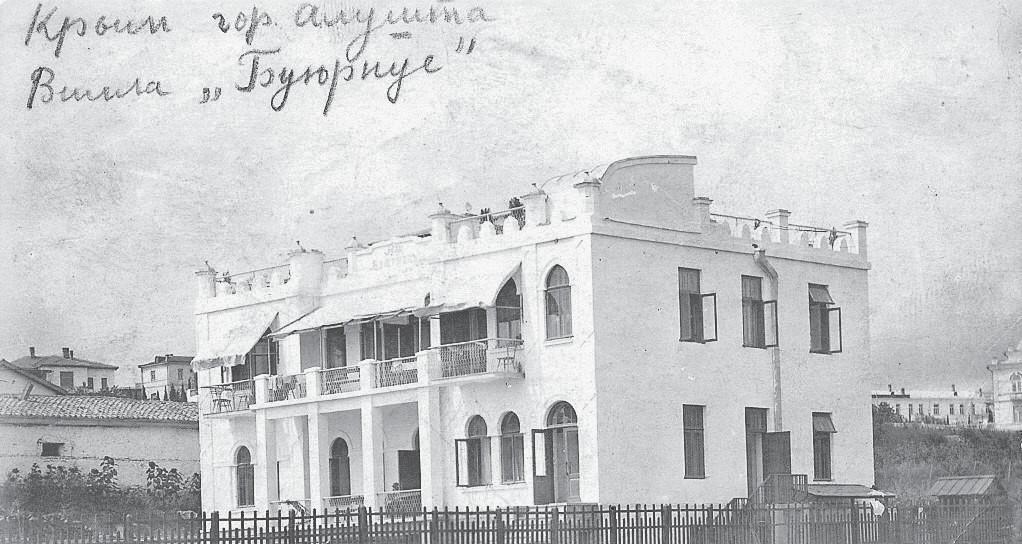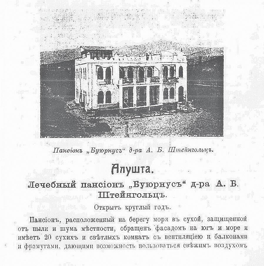Это же здание в рекламном объявлении одного из путеводителей упоминается как «Лечебный пансион доктора Штейнгольца «Буюрнус». Хотя, чуть ранее в другом путеводителе есть рекламное объявление о его врачебной практике: «Доктор А.Б. Штейнгольцъ. Внутрен., нервныя и детскія БОЛЪЗНИ. Приемъ: отъ 9-12 ут. И от 4-6 в. Алушта, Виноградная ул., дом. Н.А. Голубовой. Имеется телефонъ». Похоже, что сперва доктор арендовал другое помещение, и только позже перенёс свою практику в виллу "Буюрнус".