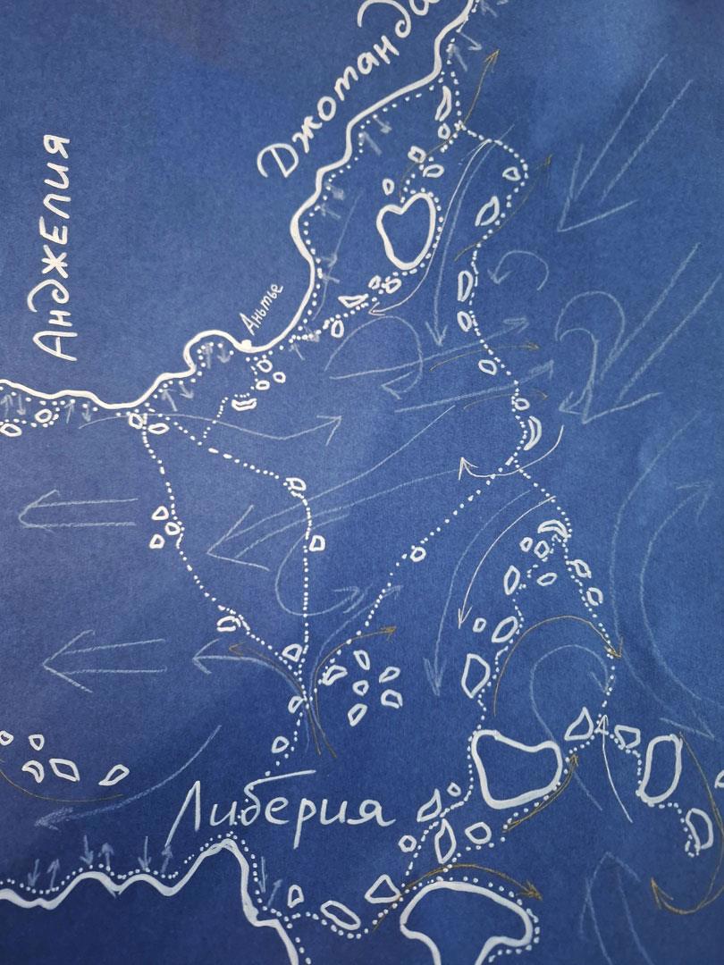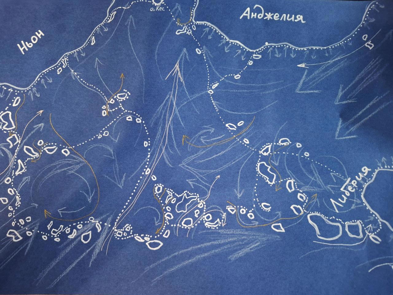Помимо корабля, я занялась проработкой морей. Вот это мы не увидим собственно в тексте (возможно, мелькнет в ретроспективах), здесь Рей пиратствовал изначально: