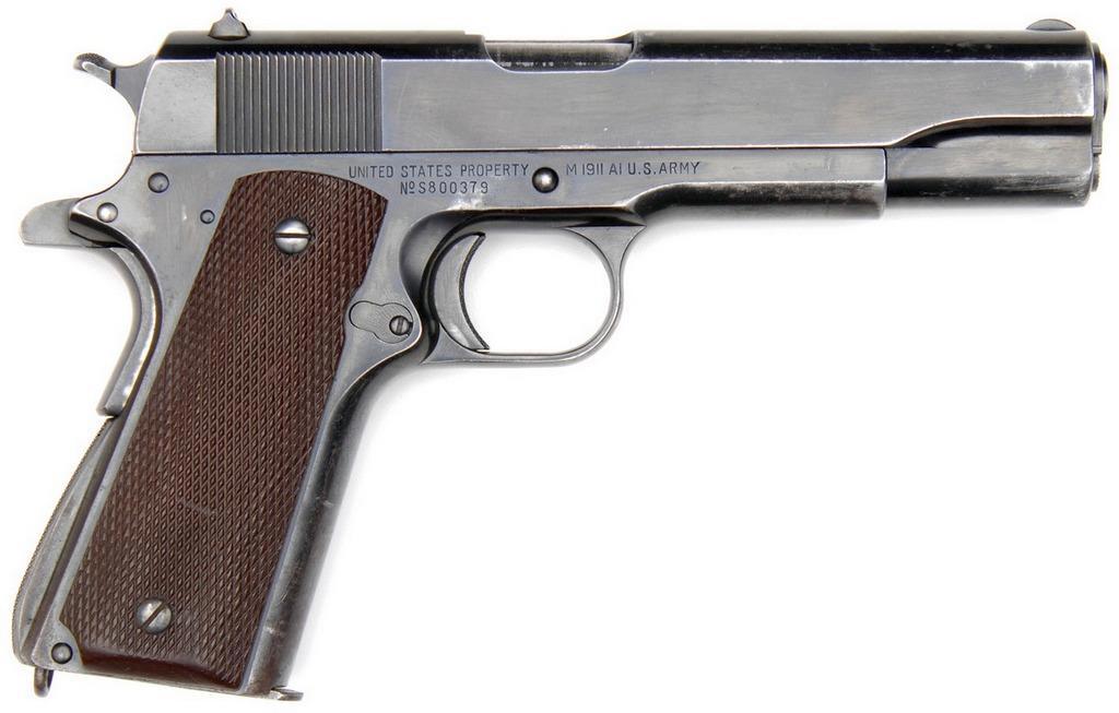 У командира «СТЕН» и ещё на груди висит в кобуре трофейный армейский «Кольт 1911». Вот такой:
