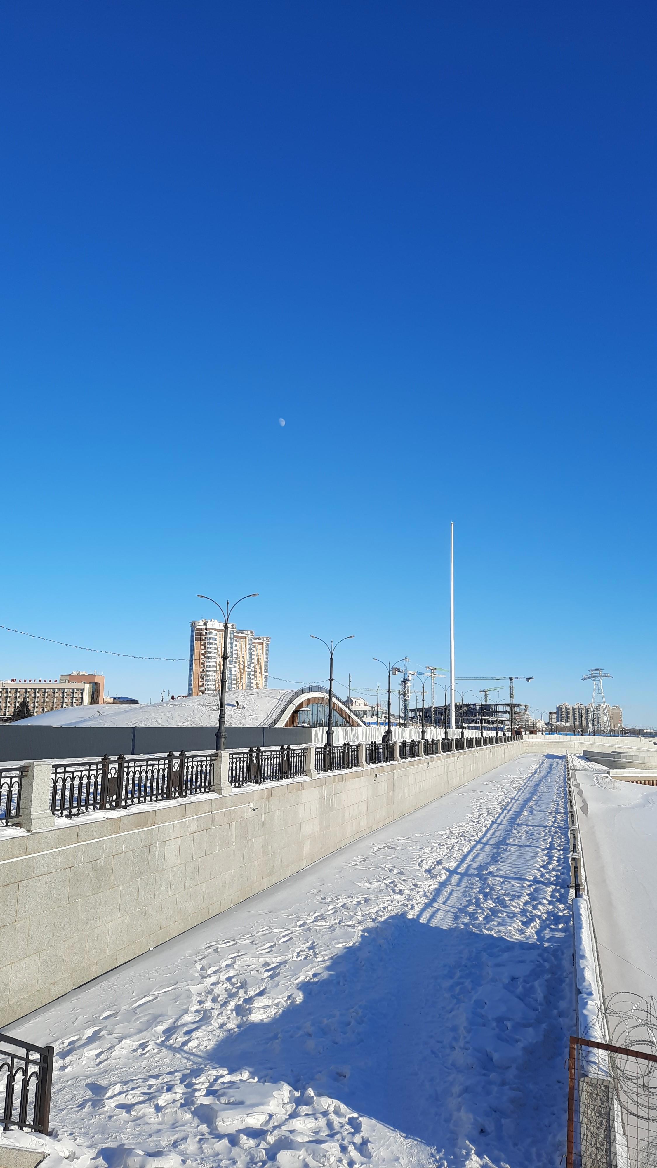 Справа стройка канатного перехода. Флагшток без флага.... и Луна.