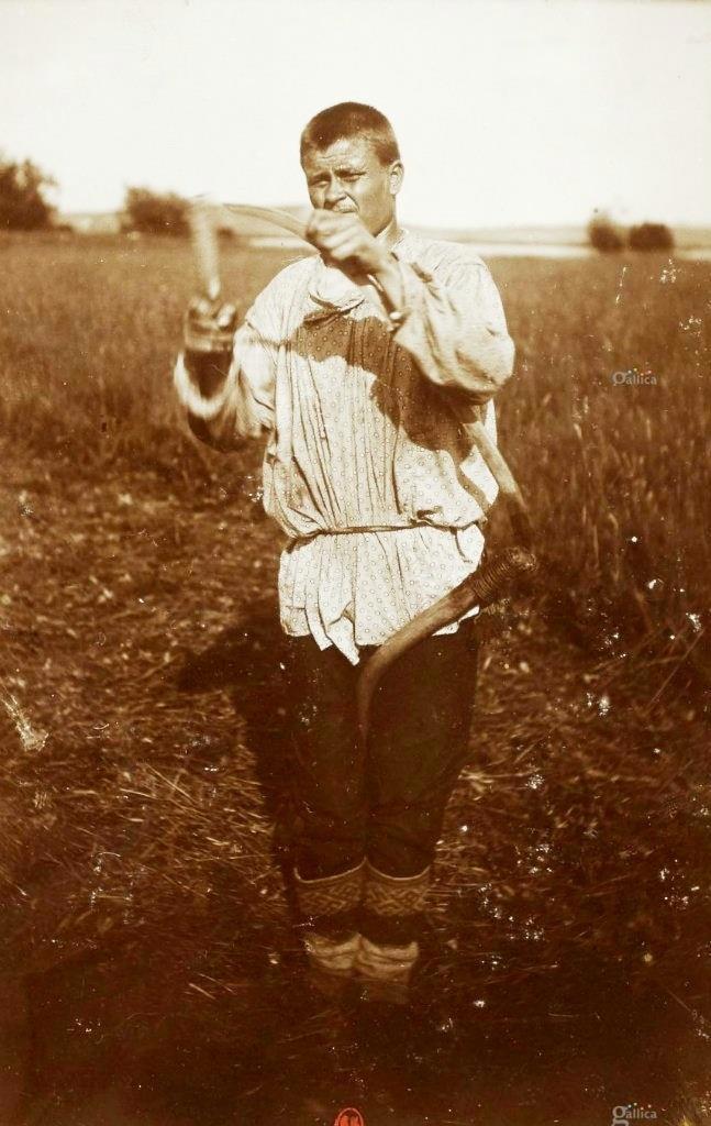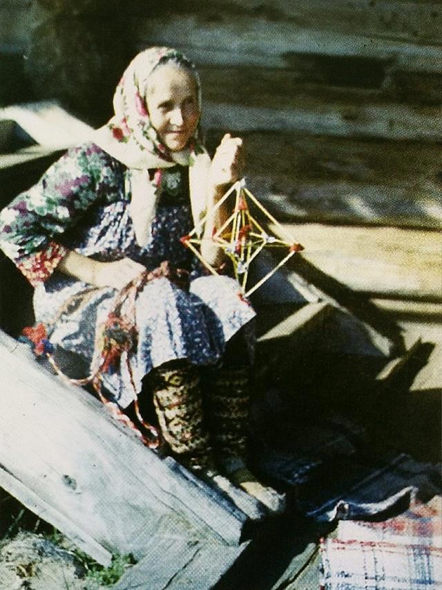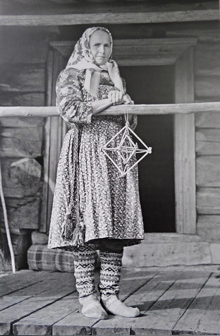 Архангельская губерния, Пинежский уезд, д. Кучкас. Это последняя деревня на реке Пинега. Дальше нет жилых поселение до самой Печоры. Вопрос, что же такое держит женщина в руке?