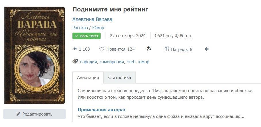 Автор: Алевтина ВараваОна приблизилась к цели и вступила под её ветхие деревянные своды, показавшие, как мало заботились читатели ресурса о лайках и об авторе своём. Запал и Азарт потому удалились, и Алевтина осталась одна. Всё было так же. Всё было в том же самом, с вечера запомненном, виде.