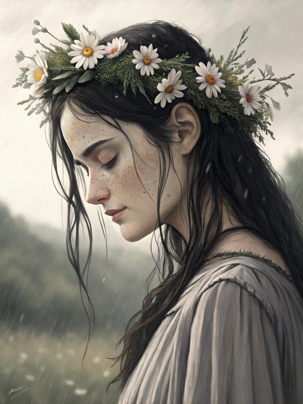 Третье место моего топа - Элпи А-Верп из романа "Сердца не покоряют силой". Ее природа "наградила" жидкими и жирными волосами, которые моментально склеиваются в сосульки (добиться от нейросети необходимого эффекта почти невозможно, увы). Находчивая Элпи научилась скрывать этот недостаток головными уборами - в основном она использует пышные растительные венки, которые отвлекают взгляд от недостатка ее волос.
