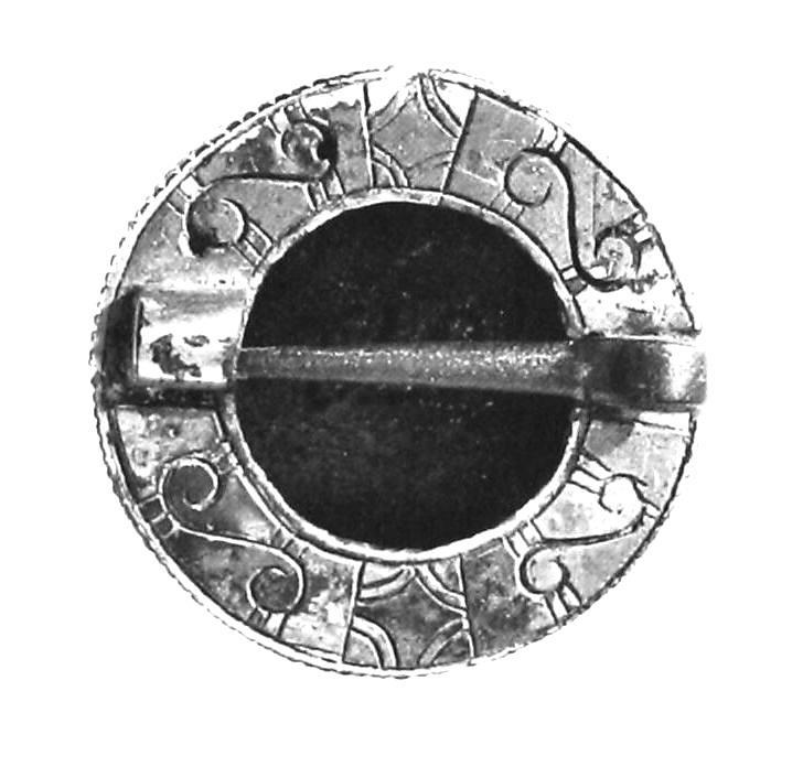 Фибула позолоченная, декорирована орнаментом в стиле Усеберг/Броа. Донышко и некоторые элементы покрыты белым металлом. Относится к типу 2, т.е. насколько я понимаю, с орнаментом типа "хватающий зверь". В данном случае имеется в виду вариант 2b, который характеризуется орнаментацией по всей поверхности без медальонов и рамок.
