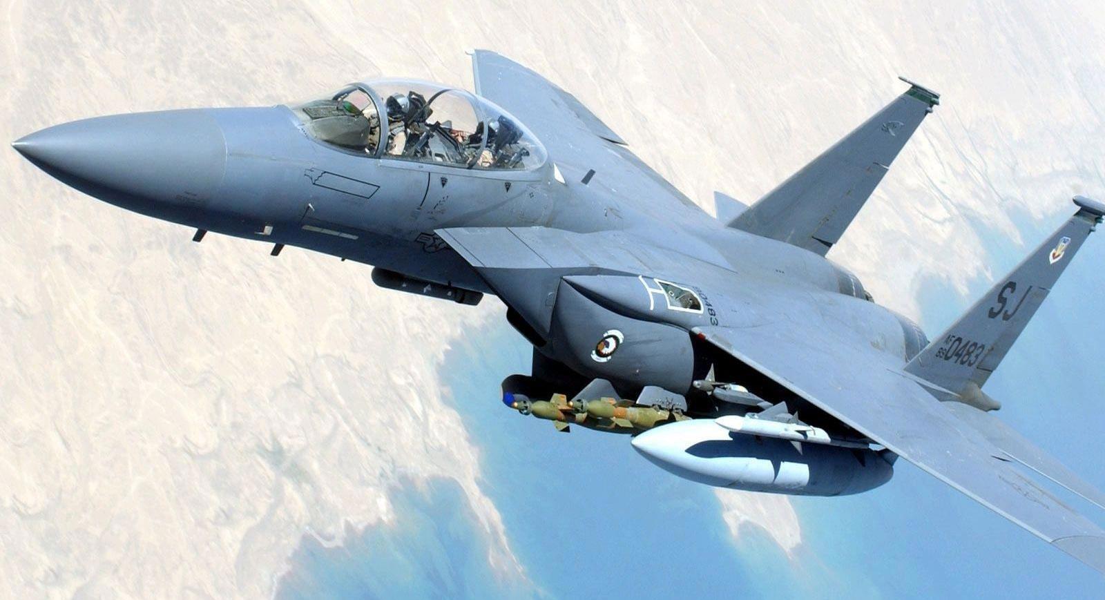 Сейчас они гордо отчитываются перед своими налогоплательщиками не о создании самолёта «будущего превосходства в небе» и даже не о поднятии «Раптора» на новые вершины, а всего лишь о том, что в серию успешно запущен (смогли-таки восстановить производство) обновлённый F-15. Вот этот самолёт во время испытательных полётов: