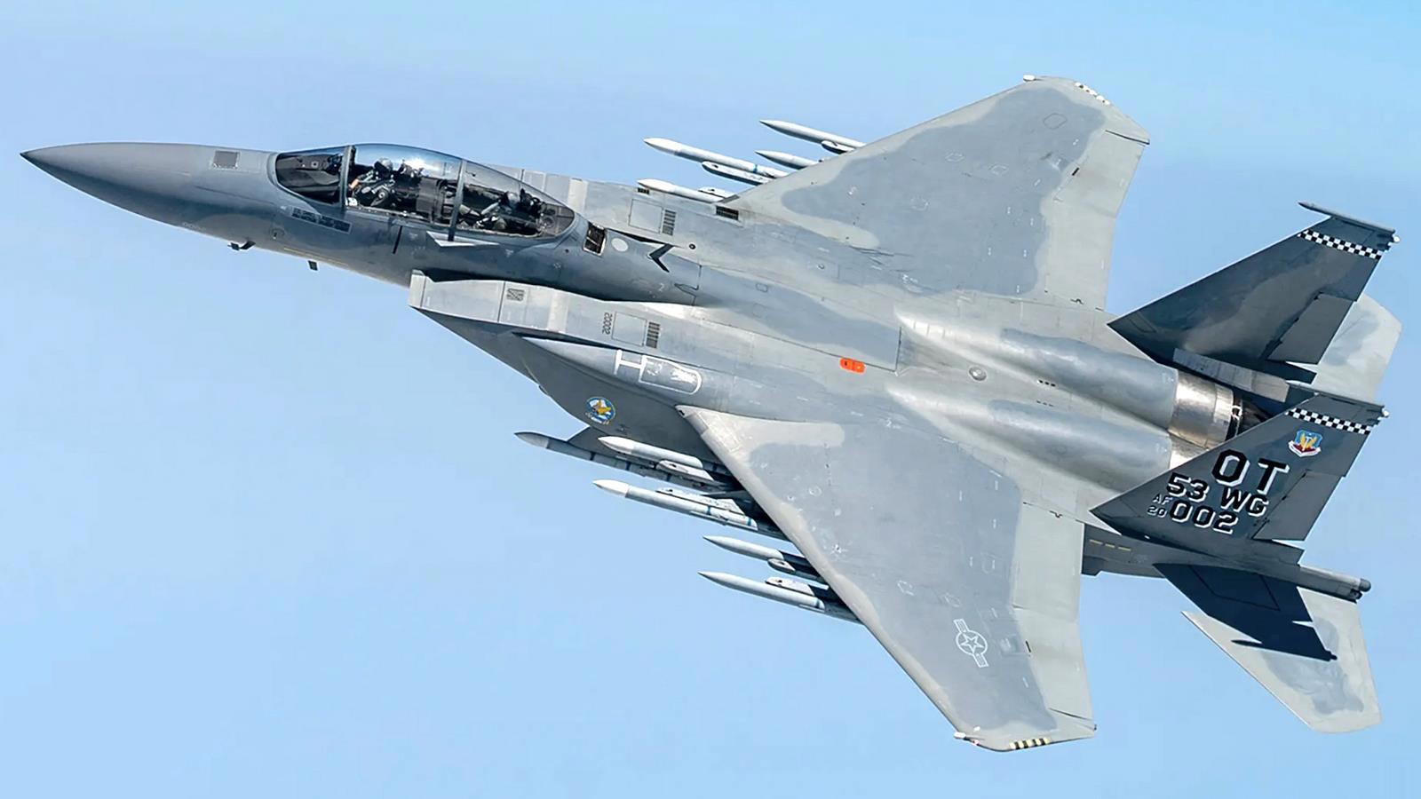 А вот это уже серийный образец McDonnell Douglas Boeing F-15EX. Из заметных изменений на самолётах хорошо видны накладные баки с горючкой для увеличения дальности полёта: