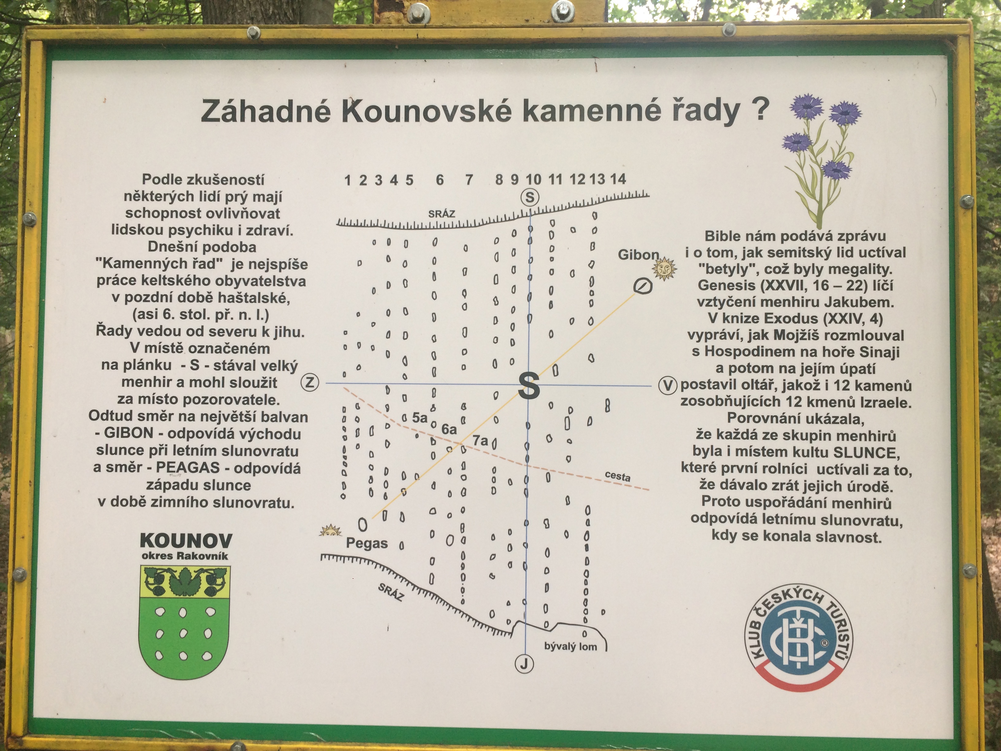 В 1934 году молодой учитель Антонин Патейдл обнаружил на холме Ровина, что севернее села Коунов, странные каменные ряды. О их существовании местные жители знали, но не считали их ничем примечательным. Но Падейдл понял, что это нечто неестественное. А когда произвел замеры и сосчитал камни, то по его спине учителя побежали мурашки. Ряды, укрытые в лесу, оказались гигантскими: несколько тысяч камней занимали площадь в несколько гектаров. Некоторые камни были так велики, что невозможно было себе представить ту силу, которая могла бы из сдвинуть. Ряды тянулись на несколько десятков метров, но самое удивительное - тянулись почти точно с севера на юг параллельно друг другу и в правильных интервалах. Падейл был уверен, что это не шутка природы, но дело человеческих рук. Но кто бы смог сотворить столь потрясающее творение и зачем?