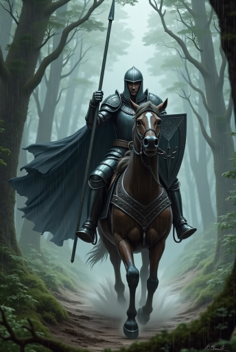 (если интересно, запрос был тот же, что и в моем предыдущем посте: "knight on horseback, black cloak, lance in right hand, triangular shield on left hand, forest, wind, rain")