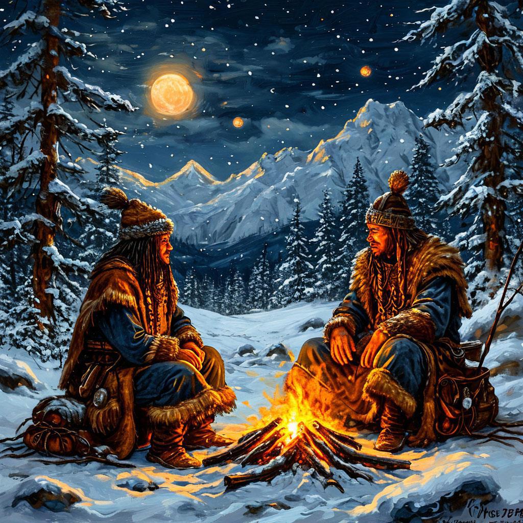 Сидит старый шаман и смотрит на костер. Напротив сидит охотник. Оба молчат. Ночь. Вокруг снег и тишина. Елки стоят неподвижно, все их мохнатые лапы белые, только отсверки пламени мелькают по веткам.