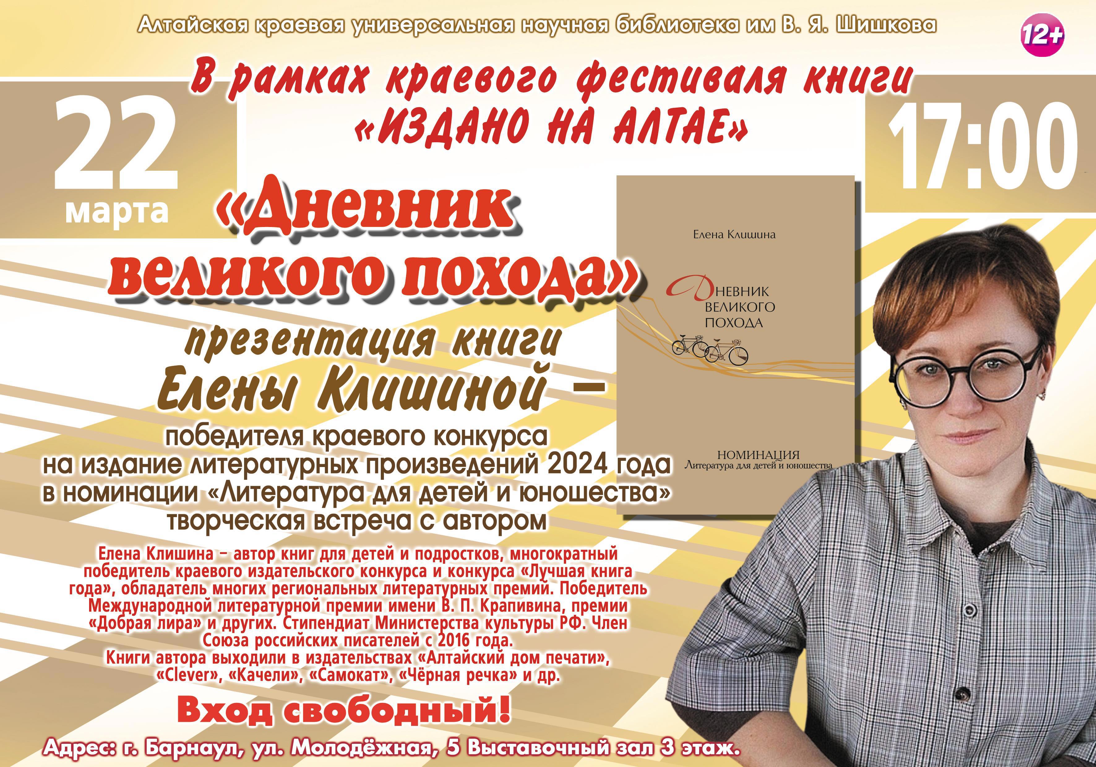📢😍📖📚 22 марта 17.00 в Алтайской краевой универсальной научной библиотеке им. В. Я. Шишкова (Адрес: г. Барнаул, ул. Молодёжная, 5. Выставочный зал, 3 этаж) в рамках краевого фестиваля книги «ИЗДАНО НА АЛТАЕ» состоится презентация книги «Дневник великого похода» Елены Клишиной – победителя краевого конкурса на издание литературных произведений 2024 года в номинации «Литература для детей и юношества»‼