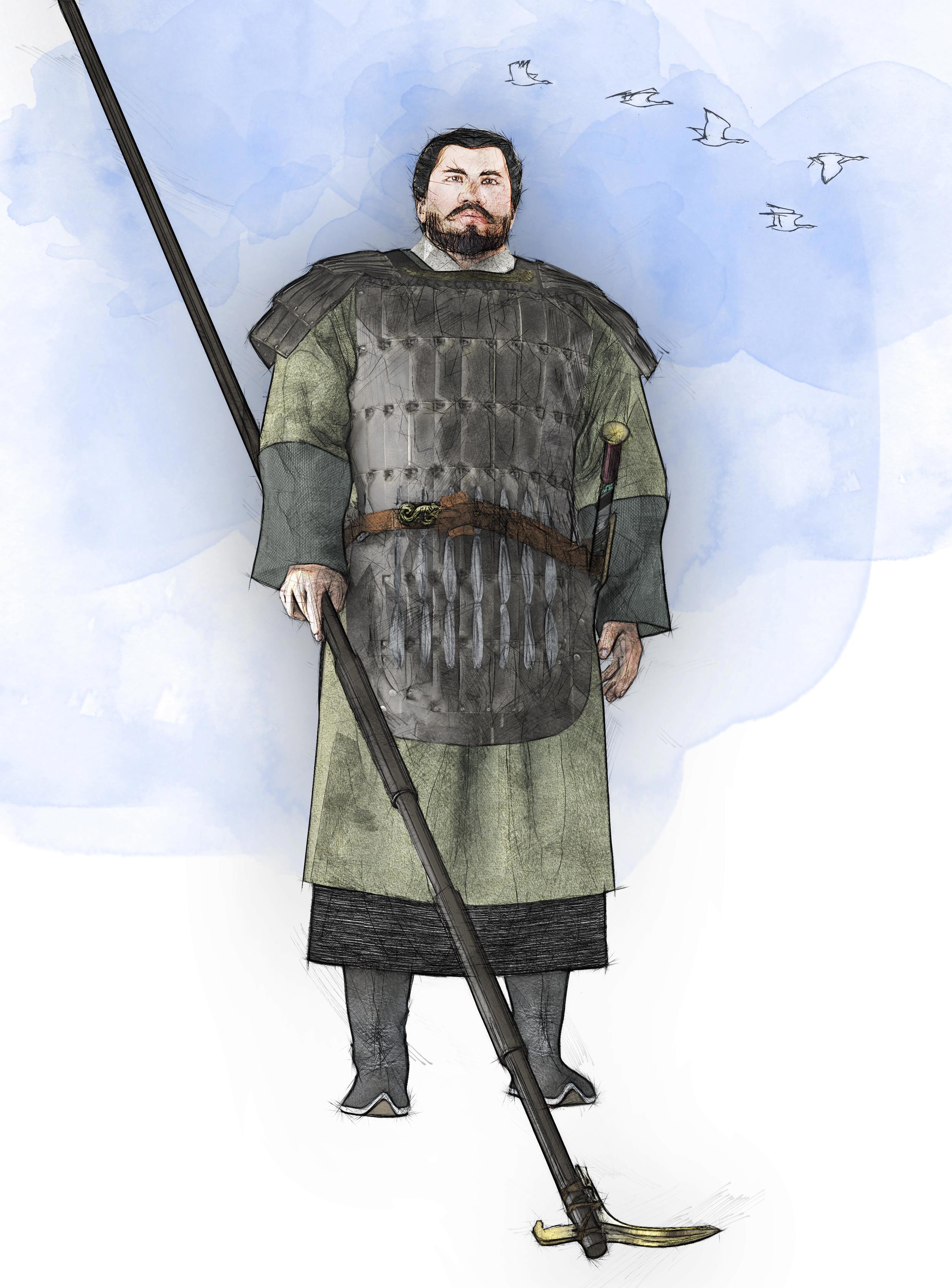 Над людьми, лошадьми и колесницами взмыл, как птица, гнедой жеребец с белой отметиной на крупе. Он летел между небом и землей, заслонив солнце своим могучим телом. Он приземлился прямо на вершину насыпи, разнеся в щепки частокол и раздавив огромными копытами нескольких циньских солдат. В руке у всадника было копье гэ длиной больше чши (3, 5 метра). Одним движением он сносил с ног десяток врагов. Защитники укреплений летели с насыпи во все стороны.И всадник, и конь рычали, как дикие звери. Глаза их горели красным огнем, а ноздри раздувались. И свои, и чужие - все в страхе разбегались от них. Циньские стрелы торчали из плечей и спины героя, но он, не заботясь об этом, продолжал крушить врагов.