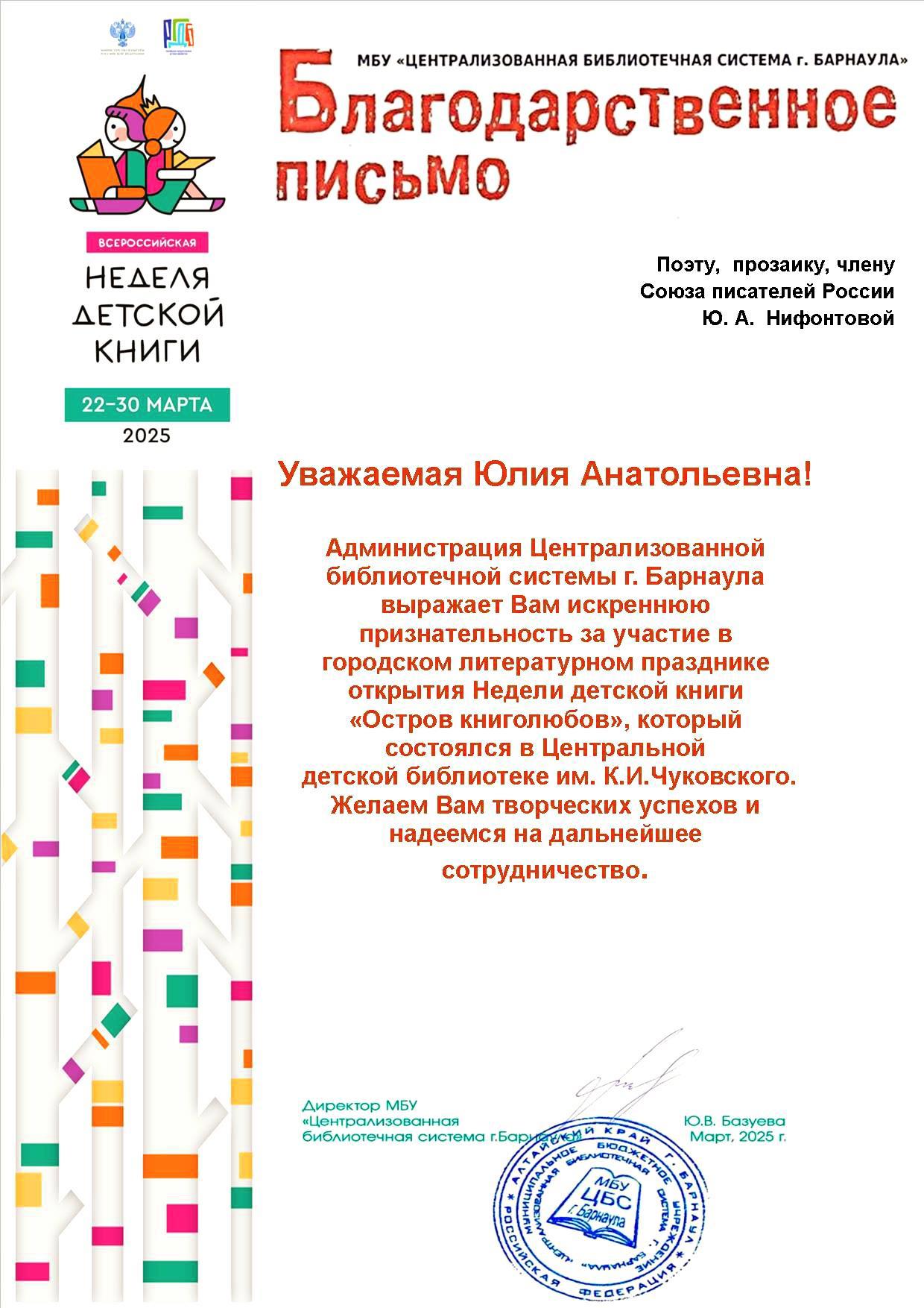 ...а Центральная библиотечная система города Барнаула в свою очередь уже поздравила меня и даже наградила Благодарственным письмом...