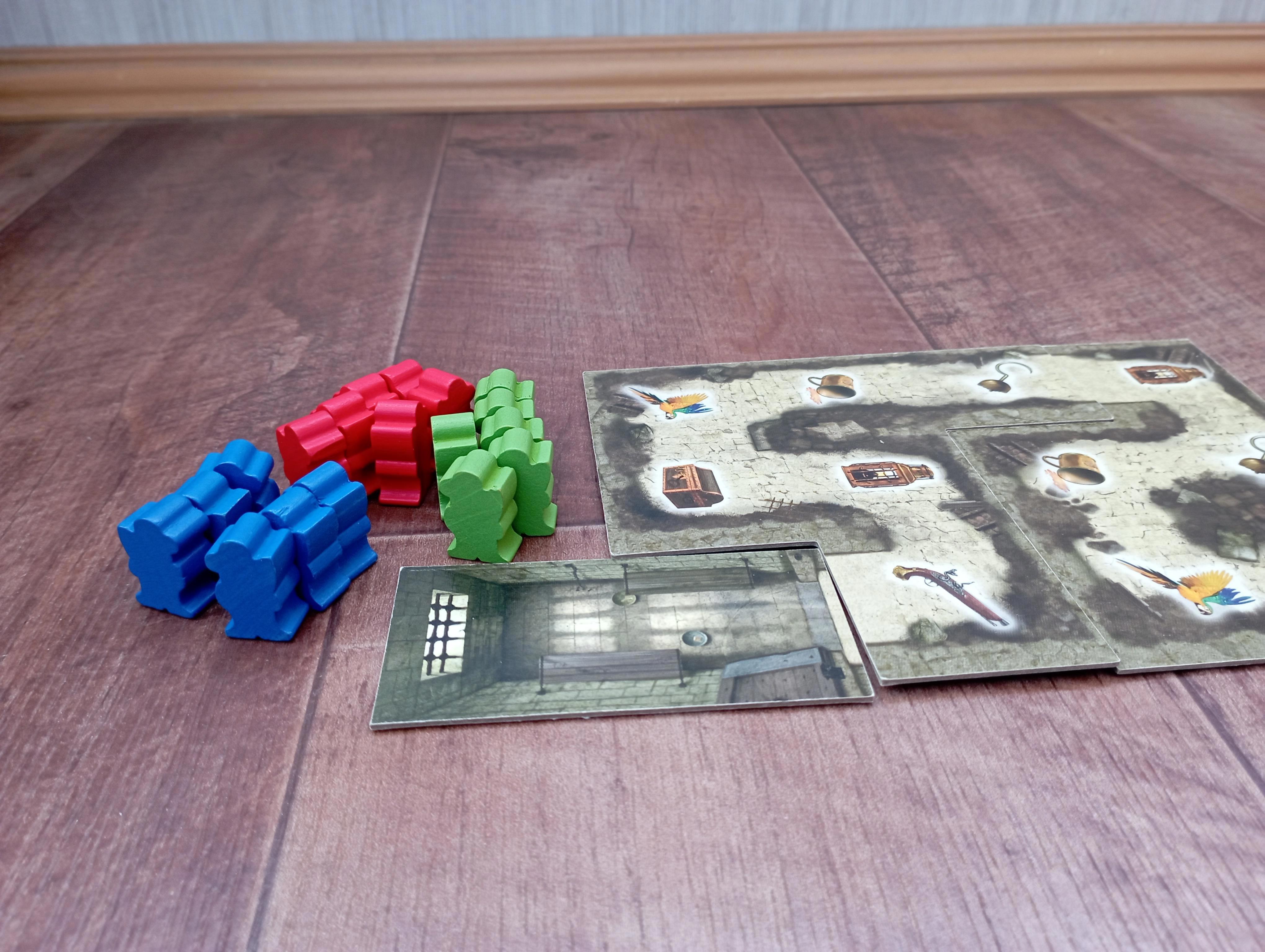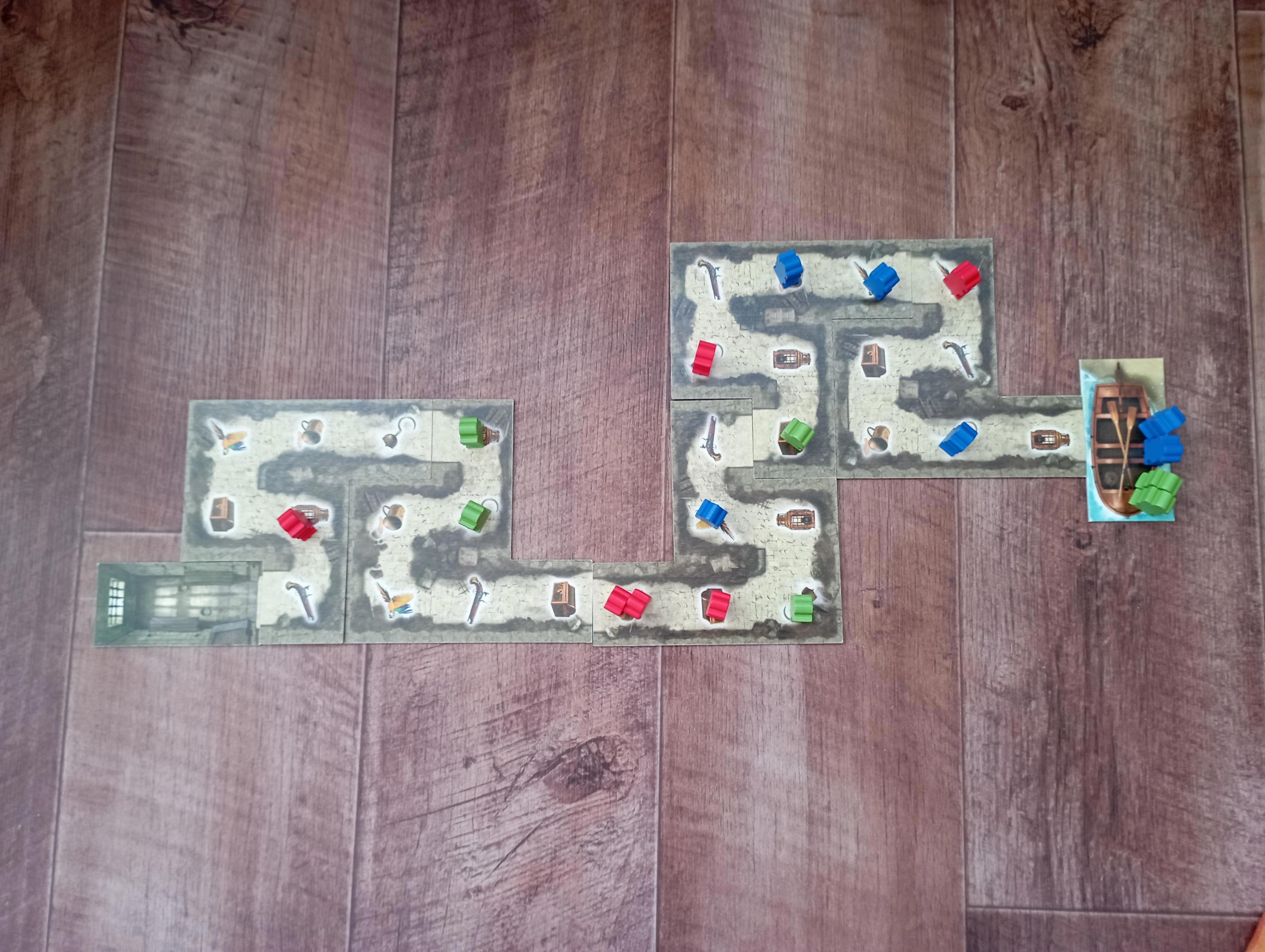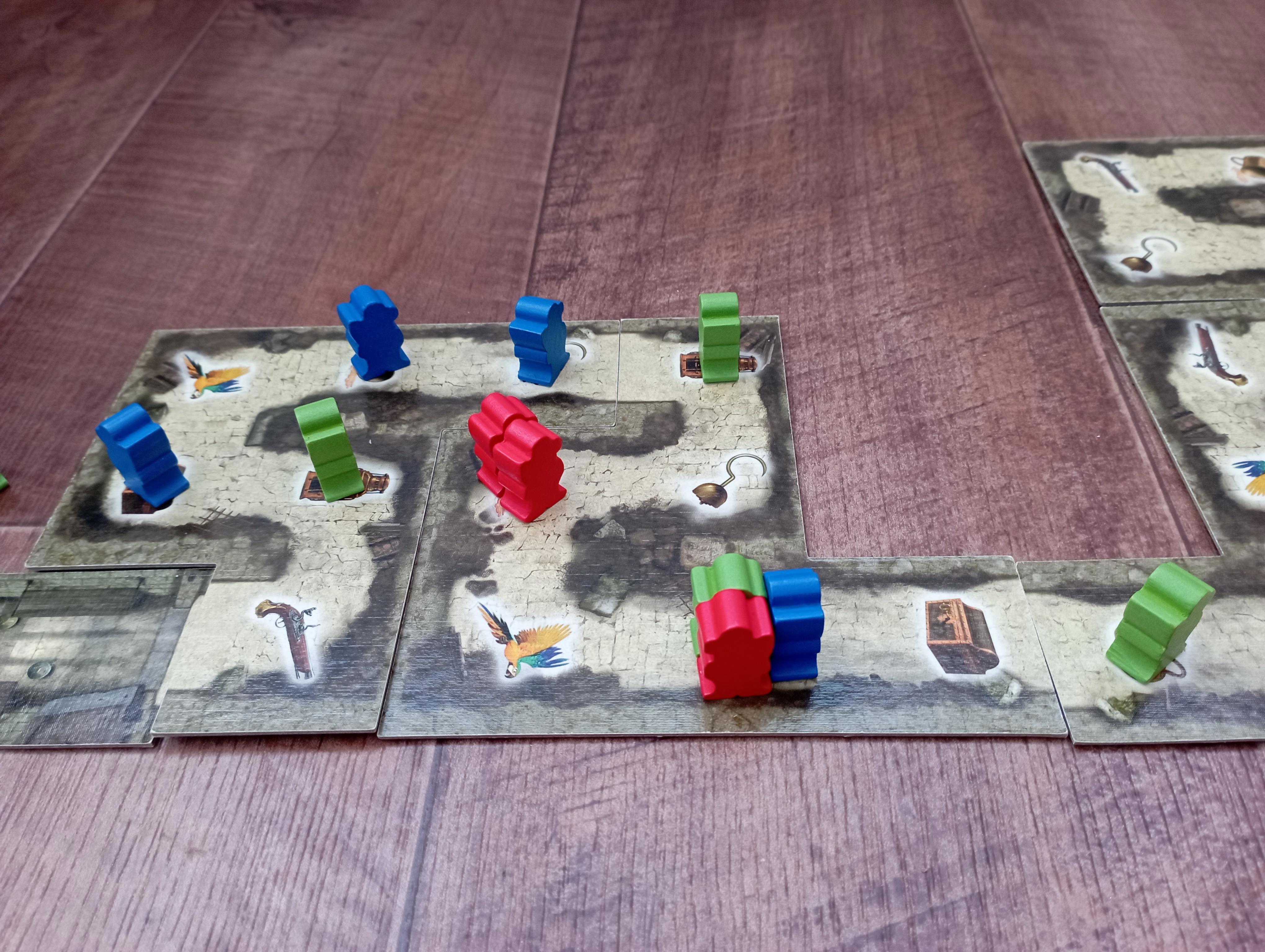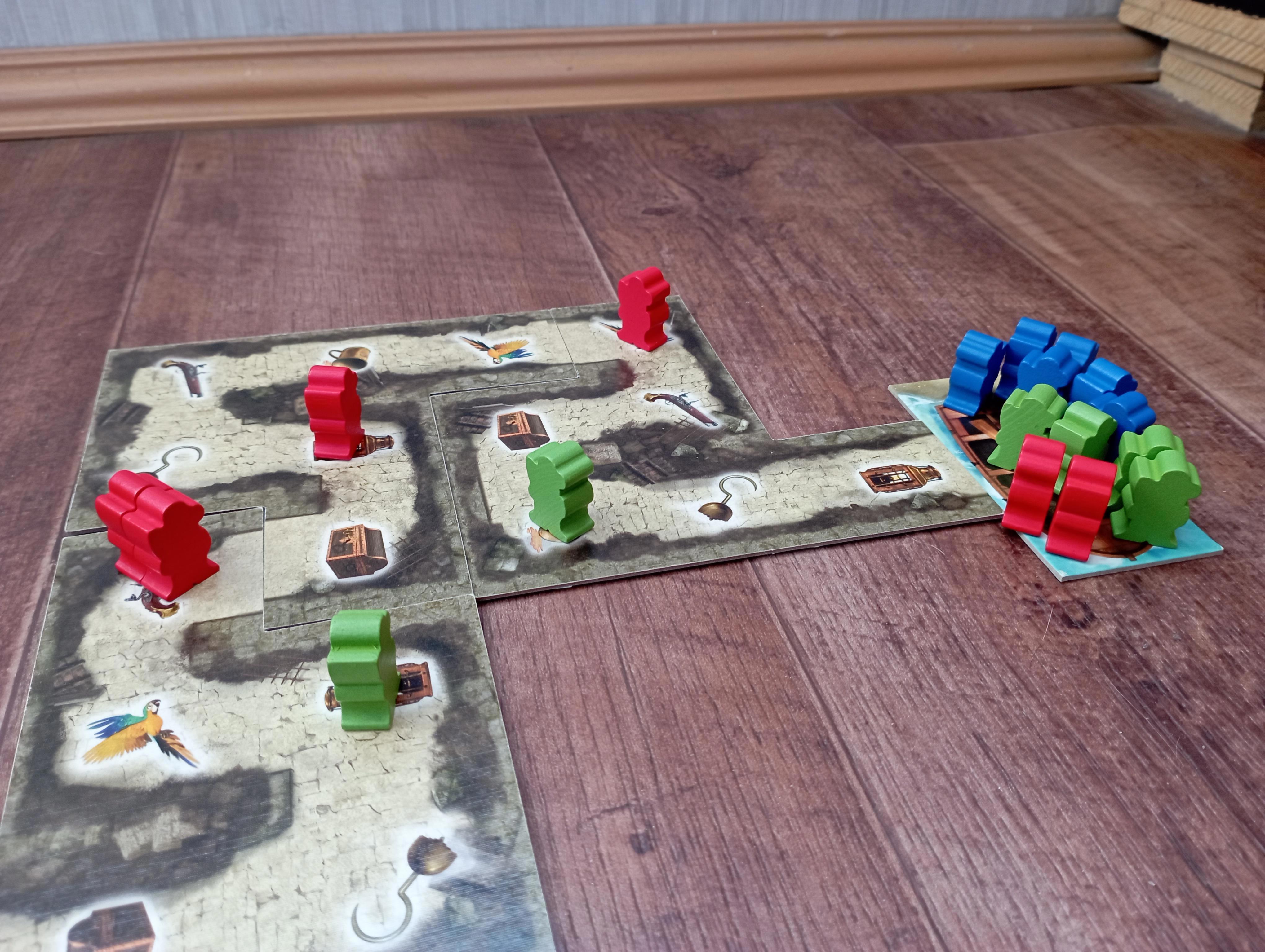 Вот примерно так будет выглядеть поле после двух-трёх ходов (красные ходили первыми). Синие вывели из тюрьмы четырёх пиратов и уже взяли пополнили руку двумя картами (обратите внимание на клетку, где стоят трое пиратов — синий сдвинулся назад к ним и стал третьим). Зелёные тоже вывели из тюрьмы четверых пиратов и активно двигают их вперёд. Красные вывели пока троих, но у них есть отличная возможность поживиться двумя картами (обратите внимание на двух красных пиратов в углу). Туда, конечно, могут встать и зелёный, и синий пират из тесной троицы, но красные ходят раньше и явно первыми используют эту возможность. А остальные — всё, не успеют.