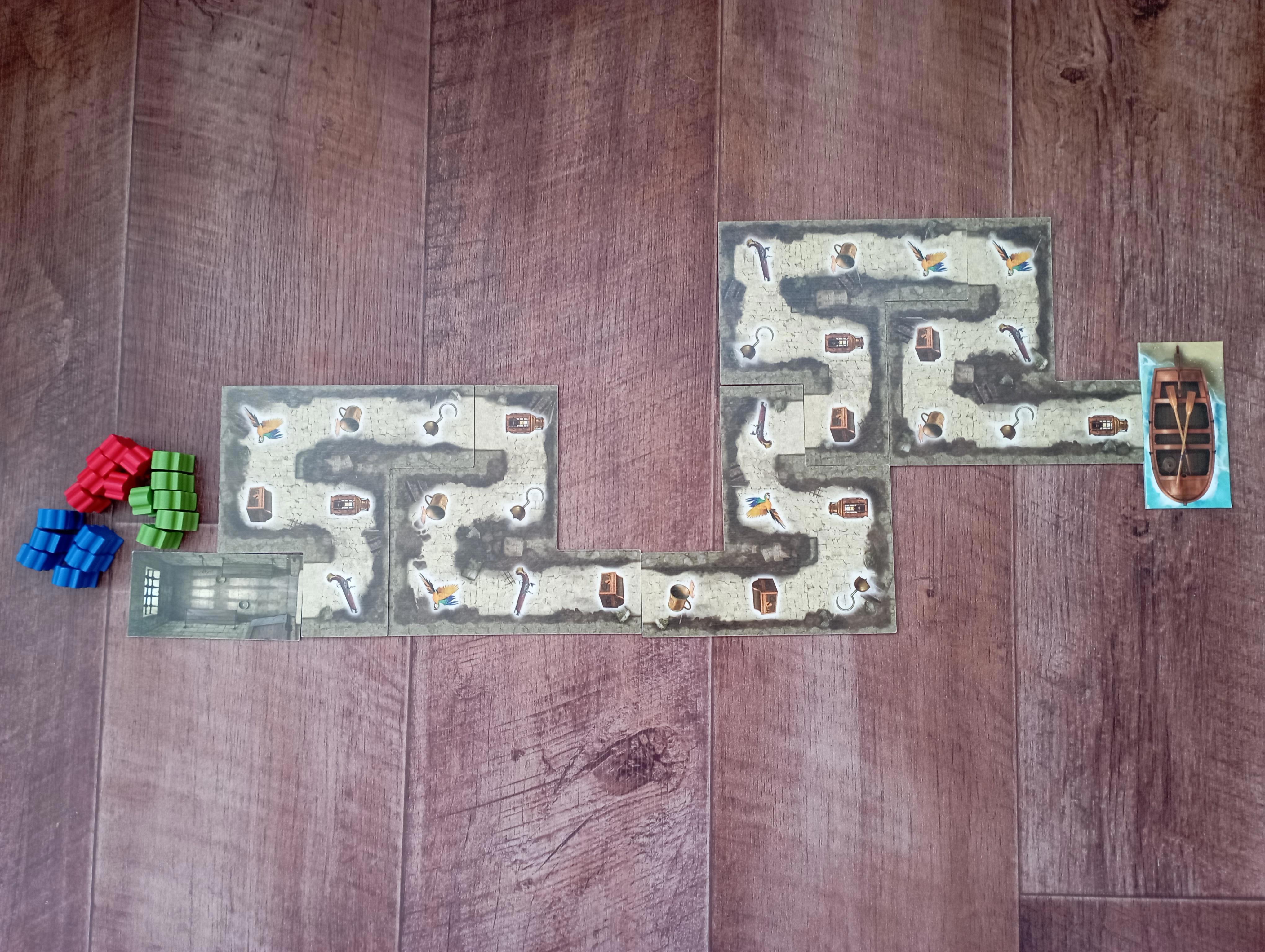Начинаем со сборки поля. В стандартном режиме используются шесть из восьми кусочков, и они кладутся подземельем вверх: пираты бегут из тюрьмы по подземному ходу к лодке. Соответственно, старт — тюрьма, финиш — лодка. Для обзора я использовала меньше кусков поля, потому что иначе в кадр не влезет :) Кусочки поля собираются как угодно, совершенно произвольно, главное, чтобы подземный ход был непрерывным. Вот примерно так выглядит путь пиратов к свободе!