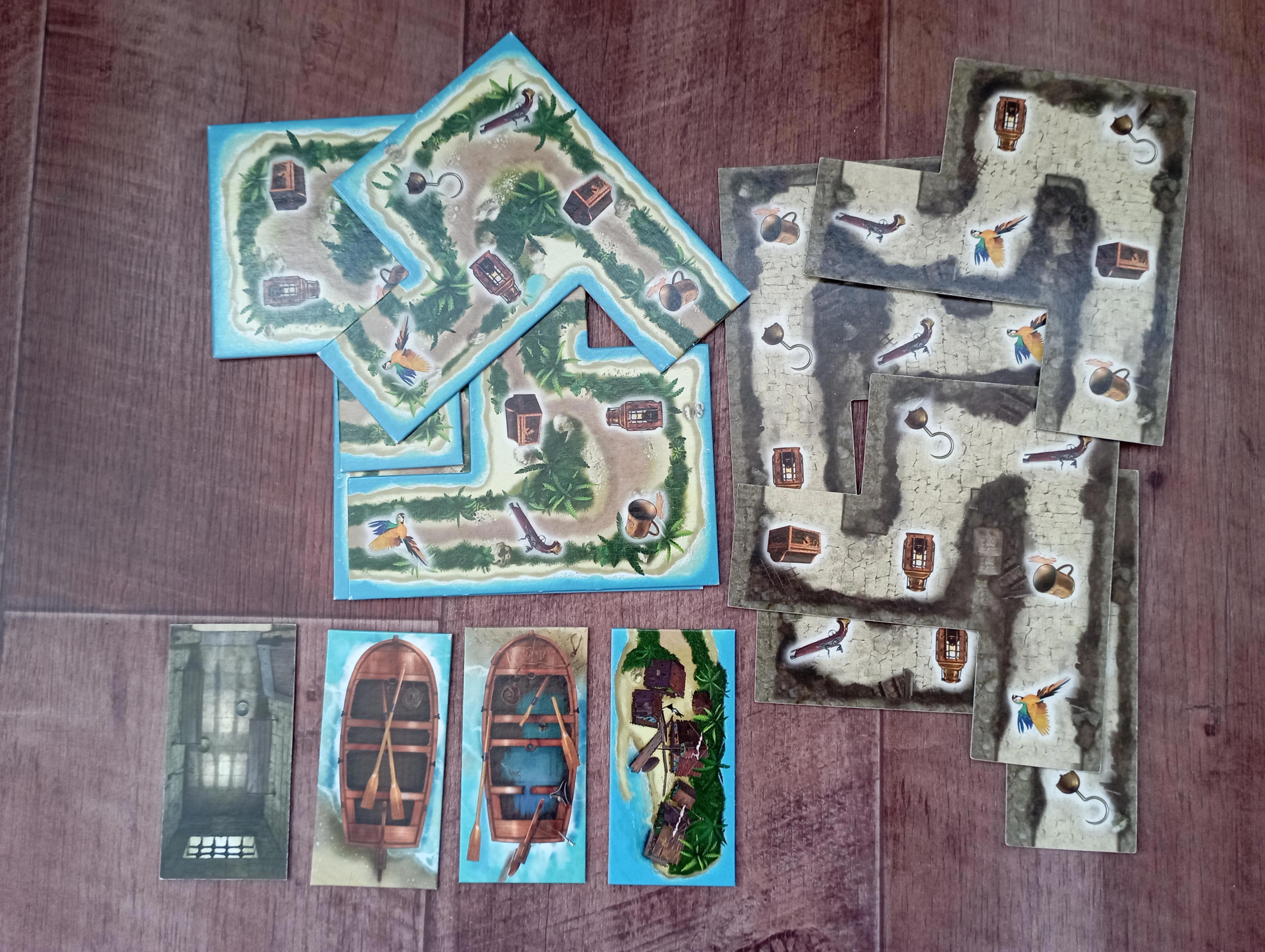 Ещё в коробке лежат части игрового поля-лабиринта. Они яркие, сделаны из качественного плотного картона. Куски поля двусторонние: на одной стороне — джунгли, на другой — подземелье. Ещё у нас есть ключевые точки: тюрьма, сломанная лодка, целая лодка, остров с сокровищами.