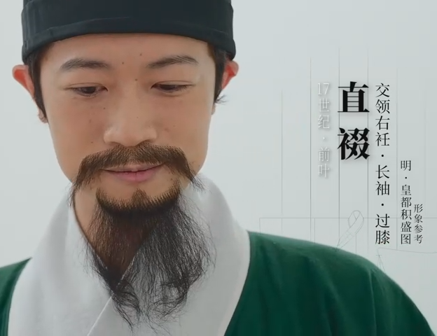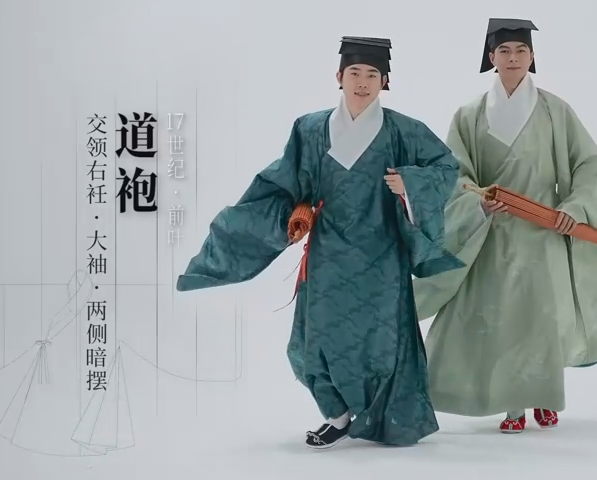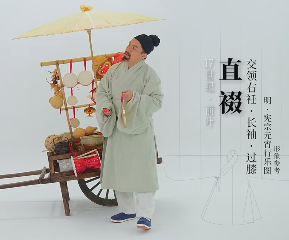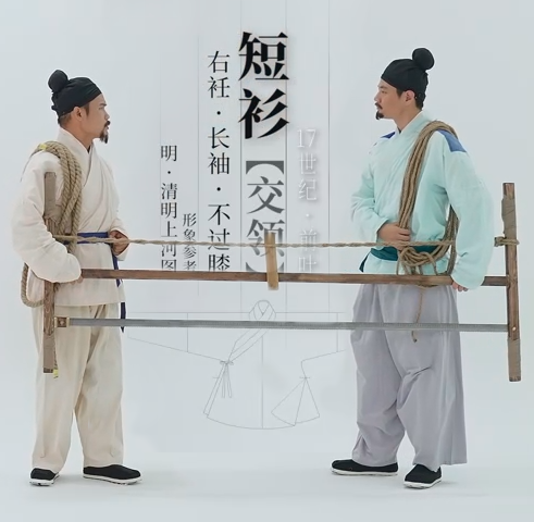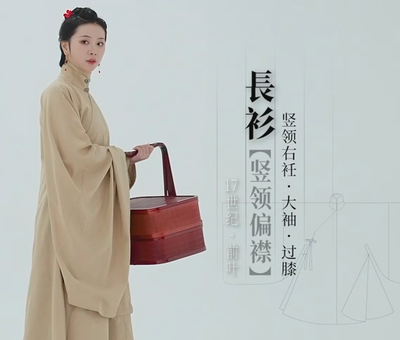 Запашной косой ворот "цзяолин" 交领·запахивается на правую сторону 右祍·длинные рукава 长袖·длина ниже колена 过膝