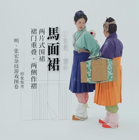 Из двух половин, частично перекрывающих друг друга 两片式围裙·два полотнища "мэнь" 门 (двери) пришиты внахлест 裙门重叠·складки с обеих сторон 两侧作褶