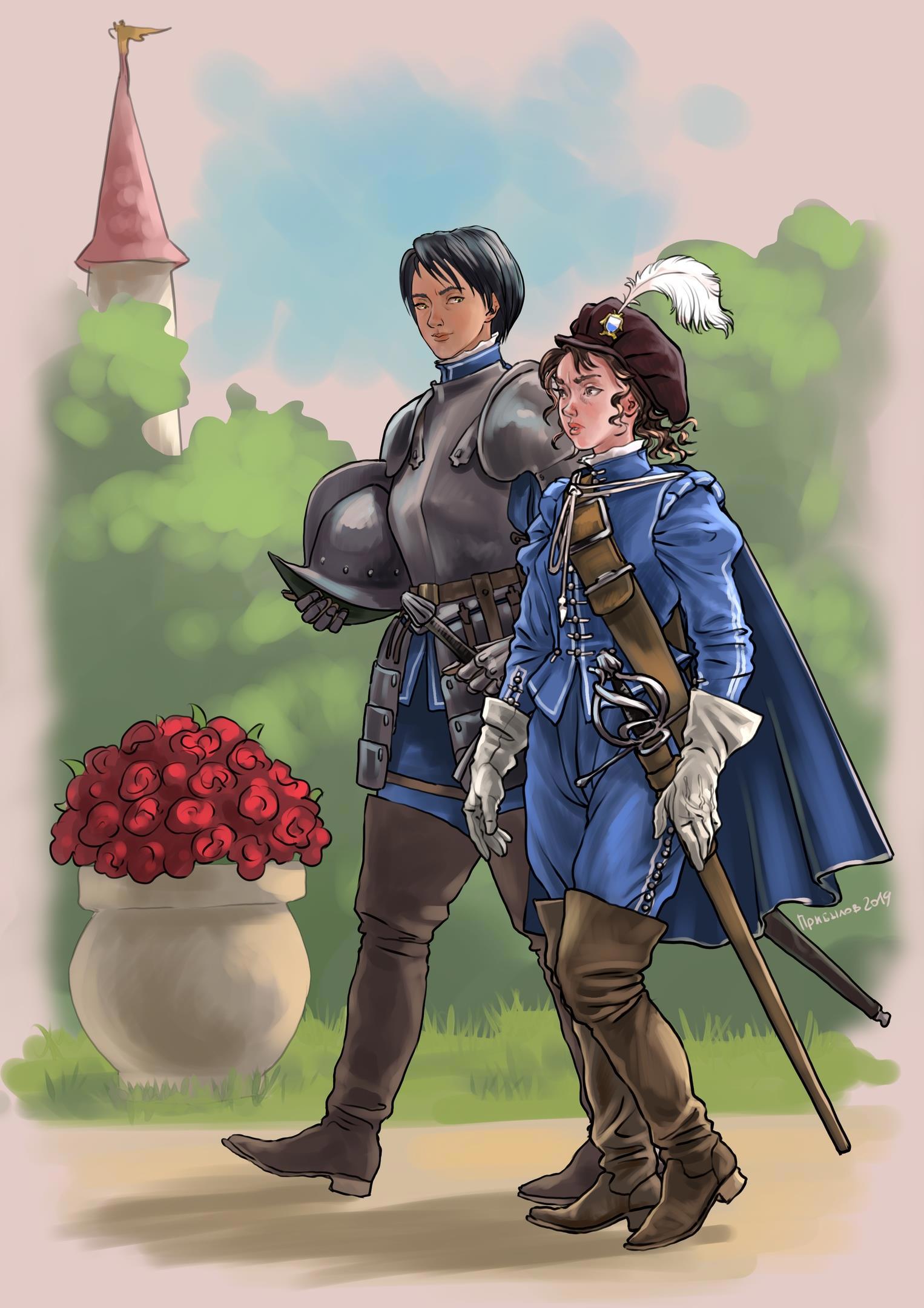Изначально я планировал заказать Александру Прибылову пять индивидуальных чёрно-белых скетчей. Но потом в сюжете появилась леди Мария, и шесть персонажей здорово разбились по парам. Подумав, я решил заказать три парных скетча. Превратить их в сюжетные сценки решил уже сам Александр. Он же решил по своему почину добавить рисункам полный цвет - ведь я оплатил только монохром. Поскольку читатели не поддержали иллюстрации донатами, мне пришлось полностью оплатить весь проект из своего кармана, а карман этот весьма и весьма тощий в последнее время. Таким образом, итоговый результат как минимум на половину - результат доброй воли художника. Работа тоже была не простой. Ни один рисунок не был утверждён с первого скетча, мы с иллюстратором достаточно долго бились над подробностями и деталями. В третьем скетче, например, очень не сразу получилось подобрать лицо леди Яны - поначалу вместо суровой черноволосой красавицы получался то мужик, то сорокалетняя угрюмая дама. Но мы справились. Ещё все три скетча я боролся с любовью Александра рисовать персонажам круглые щёчки - из шести персонажей это было уместно только для леди Эмилии и, отчасти, Даллан :)