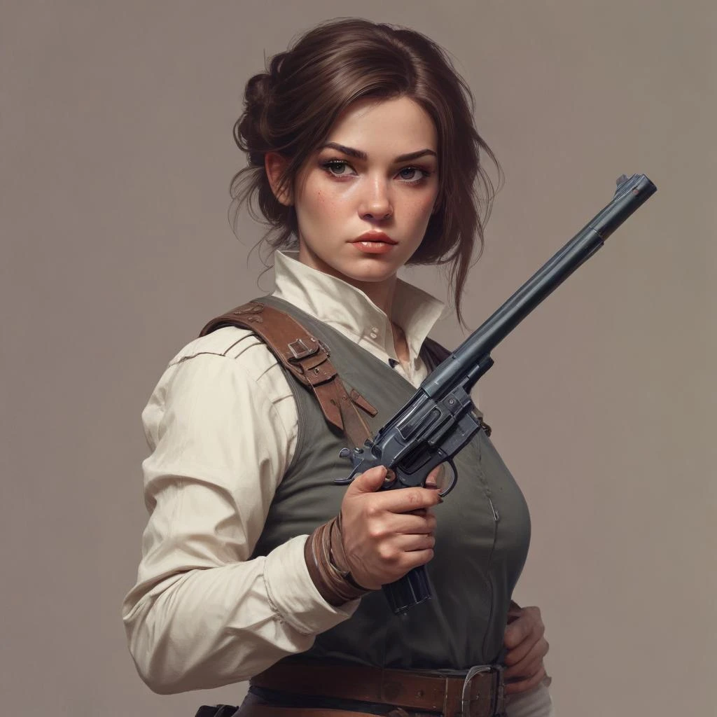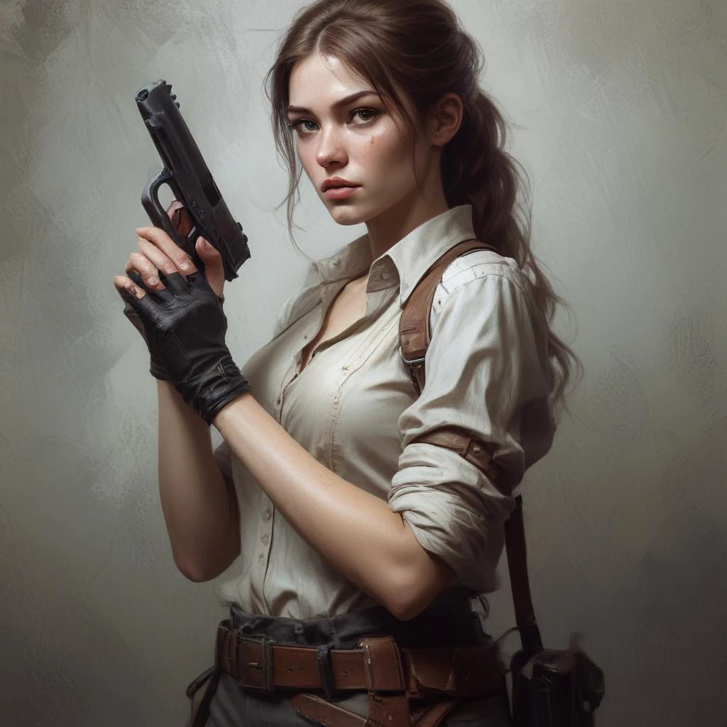 young lady armed with a pistol. Survival  horror. DnD.  digital painting. muted colors, soft color gradients.  Style of Richard Anderson