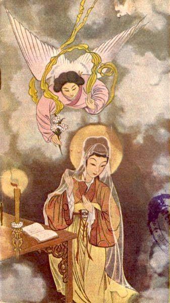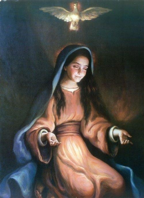 Автора этой картины не знаю, найдено на просторах католического интернета. Мне понравилось, как тут изображена Мария: светлая добрая девочка, очень человечная и близкая.