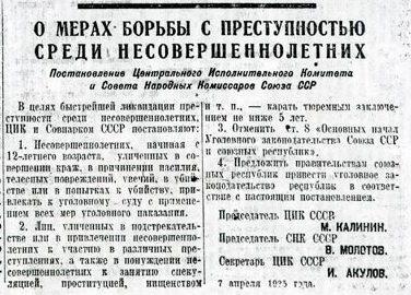 1935 — в СССР уголовная ответственность распространена на детей старше 13 лет (Постановление ЦИК и Совнаркома СССР «О мерах борьбы с преступностью среди несовершеннолетних»)