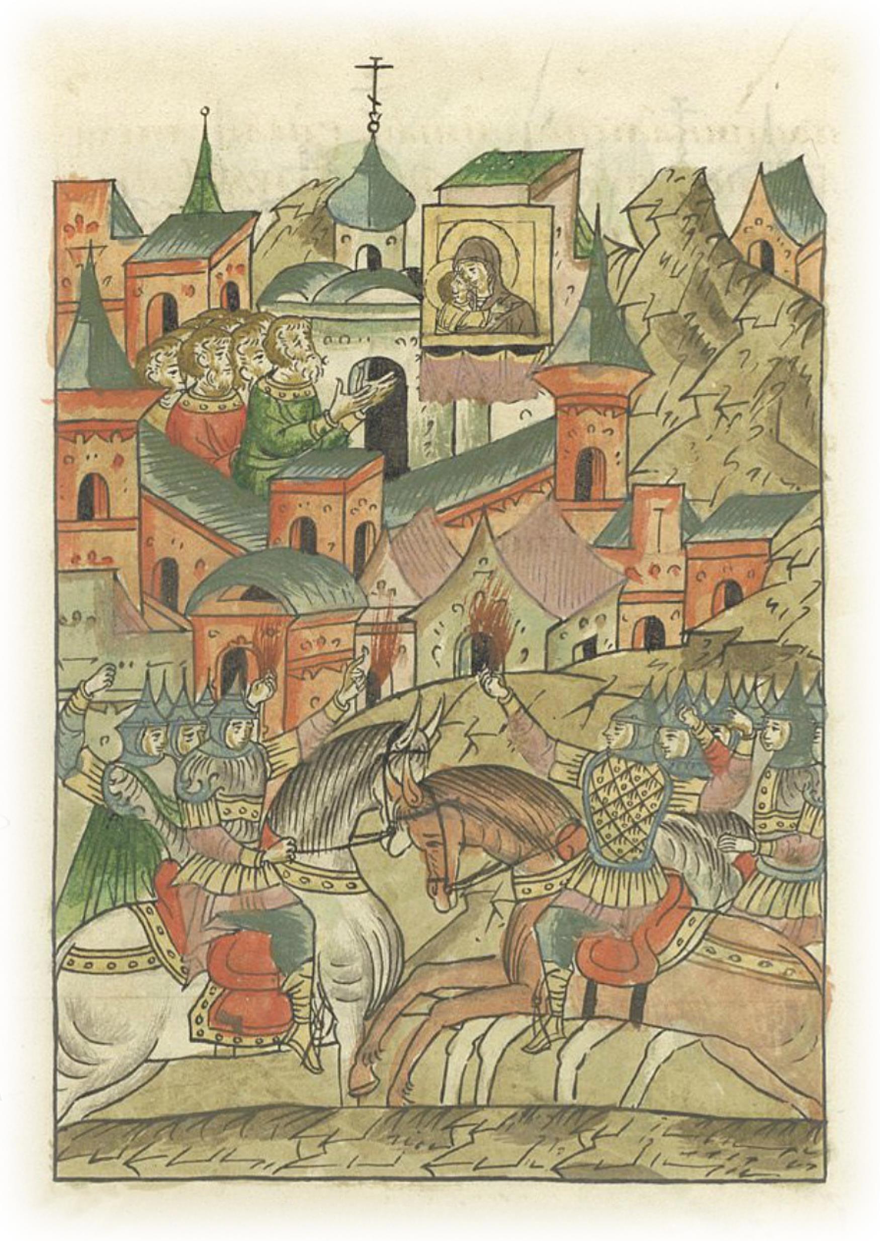 Выставленная на Оке сторожа по непонятным причинам (предположительно из-за трусости воеводы) отошла, освободив Берег и татары свободно дошли до Москвы. 2 июля они зажгли посады, пытаясь дымом прикрыть свои действия — «а тогда и засуха велика бе и с вся стороны объят град» — и приступили к воротам и пряслам, «где несть крепости каменные», т. е. к наиболее слабым участкам. К сумеркам деревянный город, окружавший Кремль, выгорел, а татары прекратили приступ. Но в Кремле не спали — готовили «на утриа пушки и пищали, самострелы и оружиа, и щиты, лукы и стрелы».