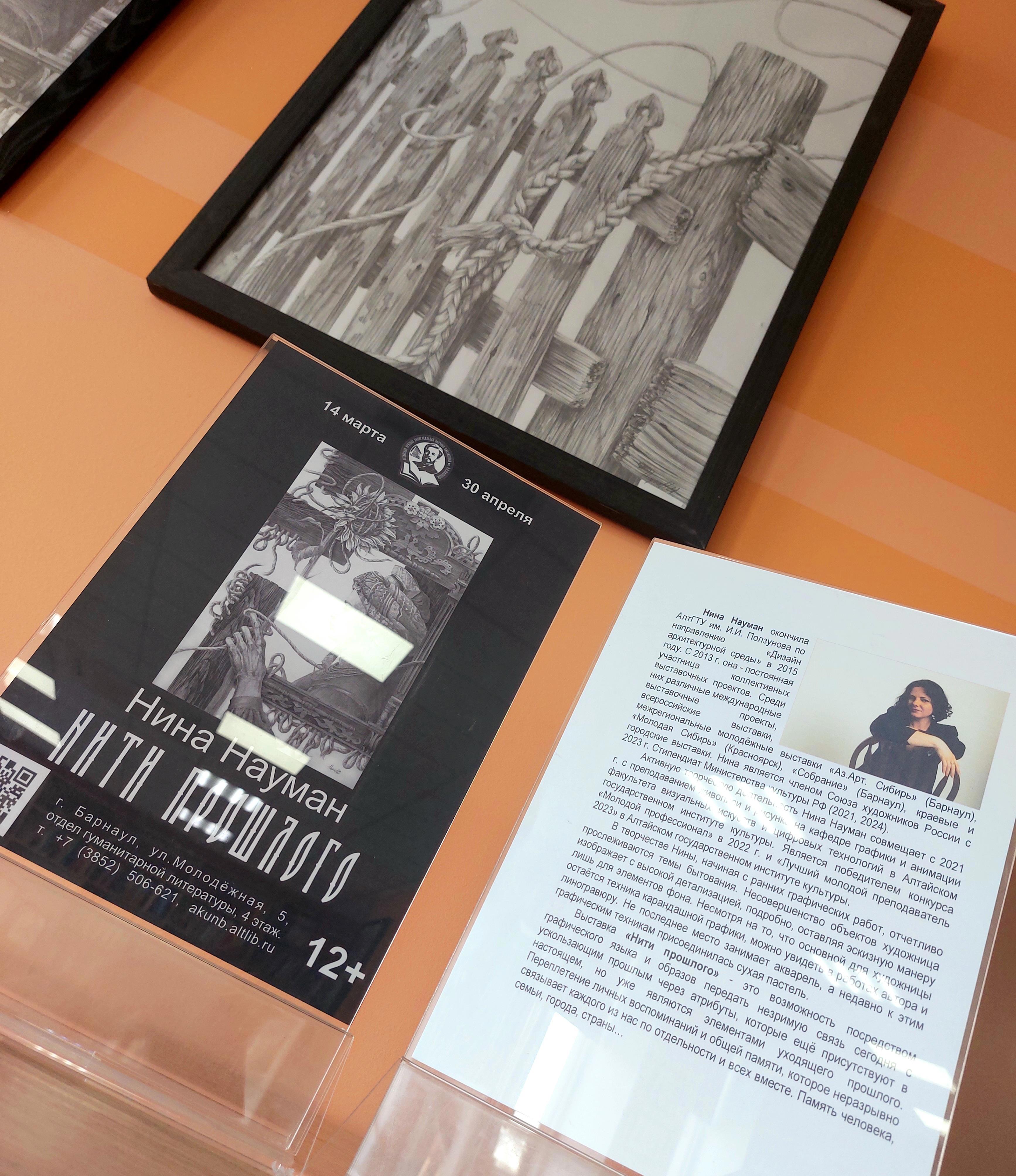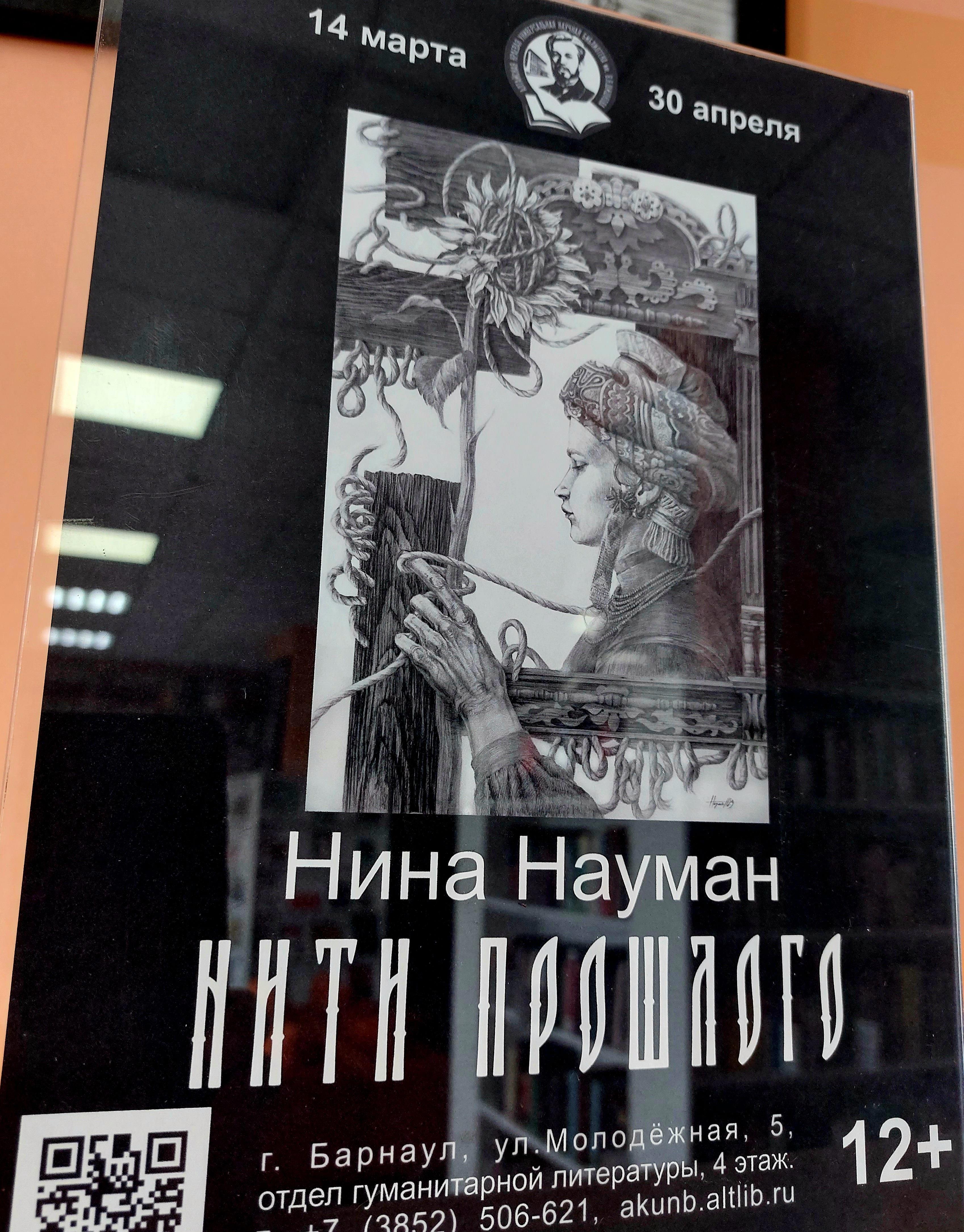В отделе гуманитарной литературы Алтайской краевой библиотеки им. В.Я. Шишкова (Барнаул, ул. Молодёжная, 5. Читальный зал, 4 этаж) действует персональная выставка графических работ Нины Науман «Нити прошлого»