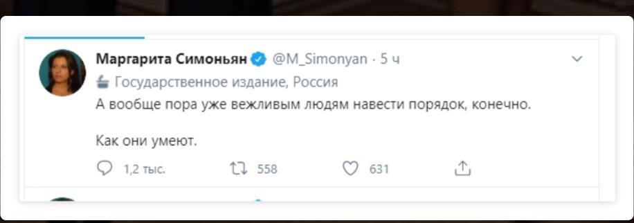 «Симоньян подчеркнула, что допускает возможность случайного задержания журналистов «в огне таких событий», но призвала собеседника разобраться в том, почему работников СМИ держали несколько суток в изоляторе, били и не кормили.