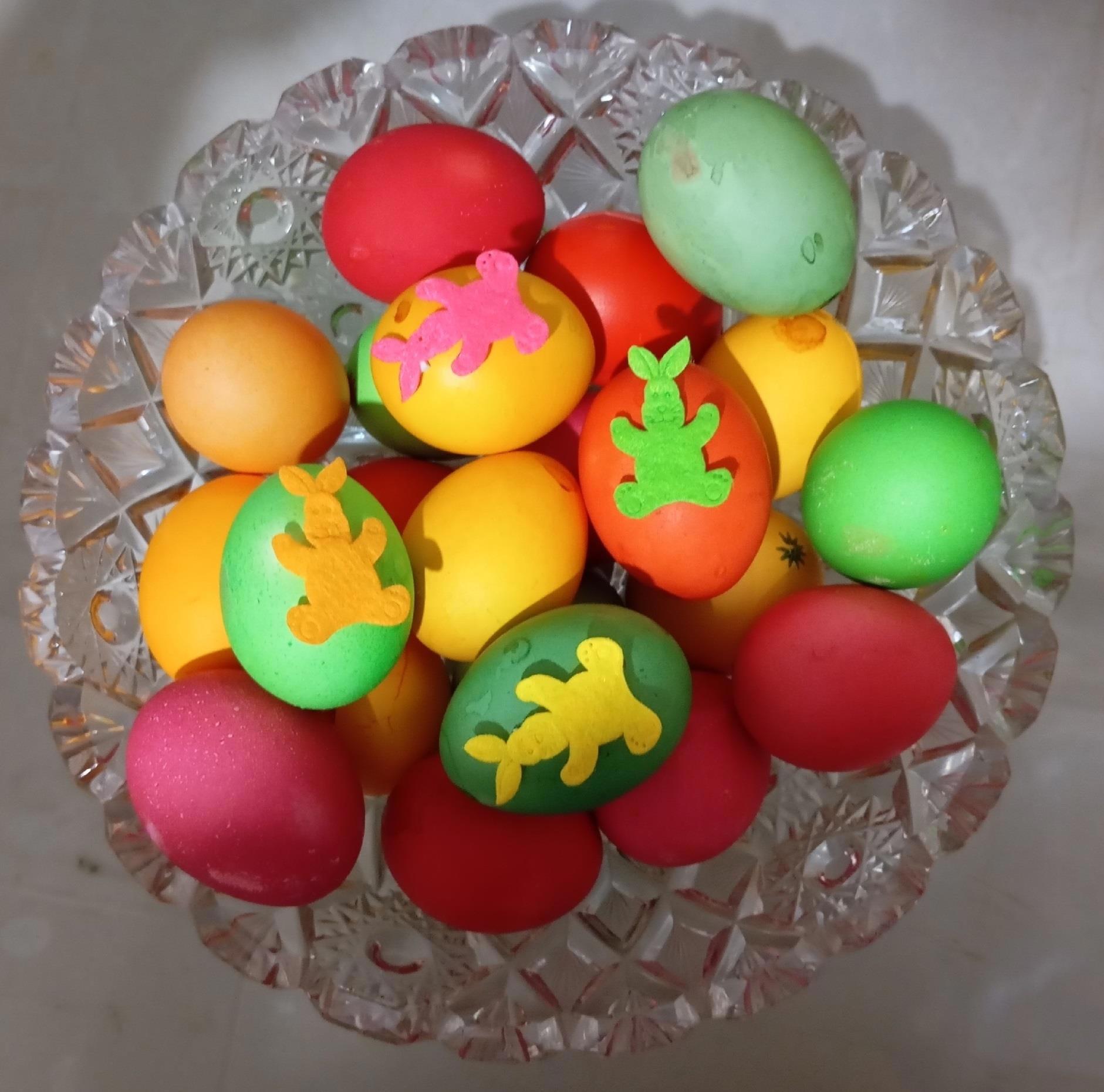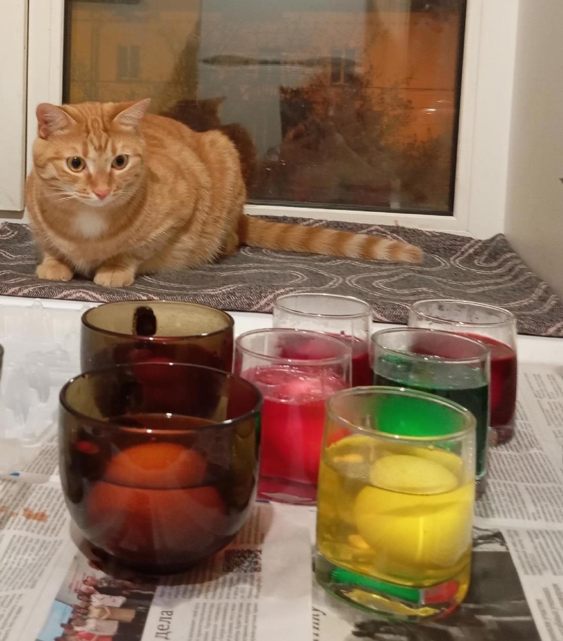 Яйца мы традиционно красим всей семьёй. Котик Яша тоже человек: оказывал нам с мужем моральную поддержку, даже запах уксуса стоически терпел. На сей раз получился позитивный светофорик с зайками, а золотые надписи не получились, потому что у нас лапки. Зато с душой! А куличики покупные, поэтому в фотосессии не участвовали. Только хардкор хендмейд!