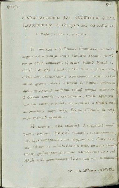 Свѣту извѣстно, что имѣвъ со стороны НАШЕЙ толь справедливыя причины не одинъ разъ вводить войски НАШИ въ Татарскую область, доколѣ интересы Государства НАШЕГО могли согласовать съ надеждою лучшаго, не присвояли МЫ тамъ себѣ начальства, ниже отмстили, или наказали Татаръ, дѣйствовавшихъ непріятельски противъ воинства НАШЕГО, поборствовавшаго по благонамѣреннымъ въ утушеніе вредныхъ волнованій.