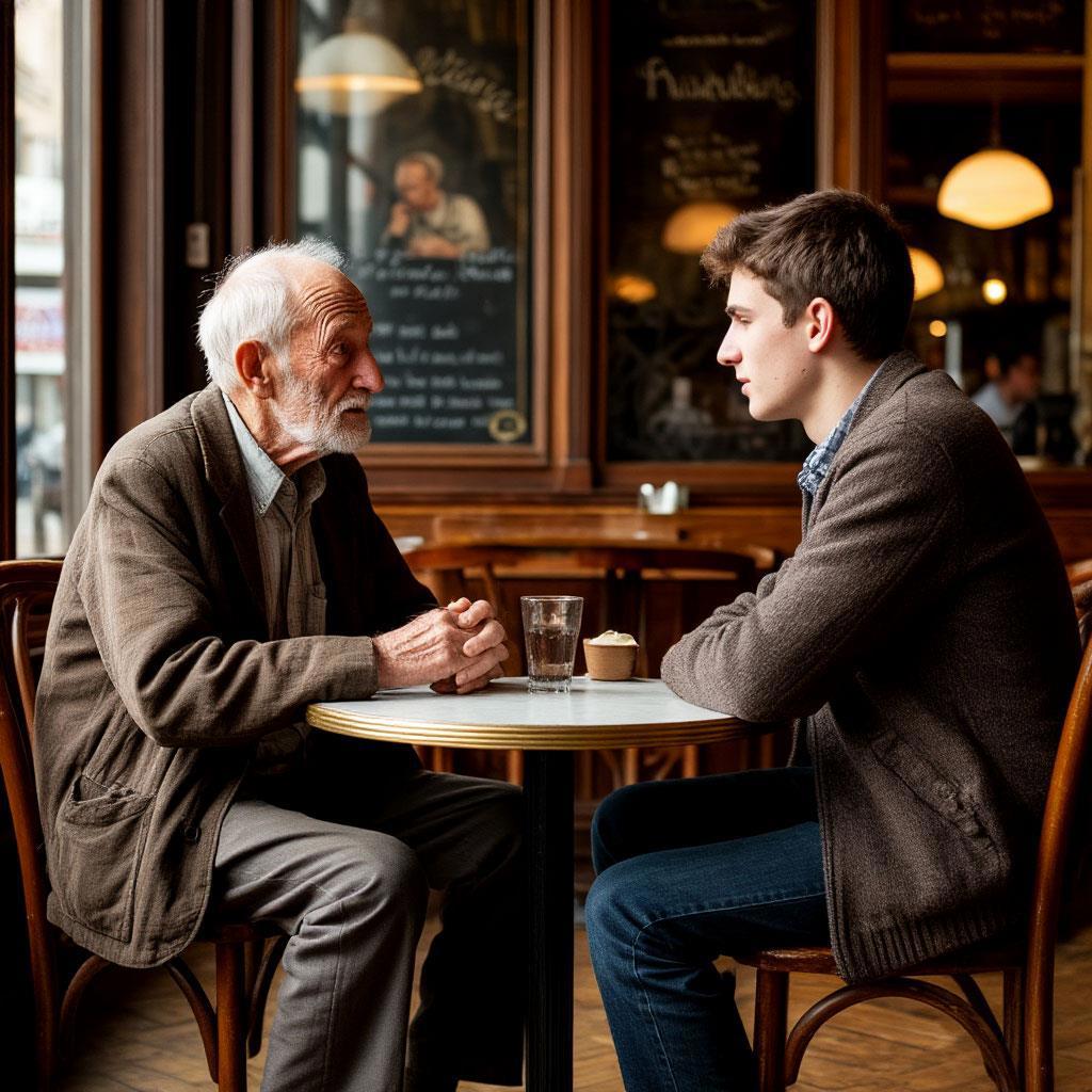 - Я сейчас уйду, а ты подойди к женщине. Она хочет с тобой познакомиться, - мужчина глянул на старика и развернулся. Не подходя к своему столику, он вышел из кафе.