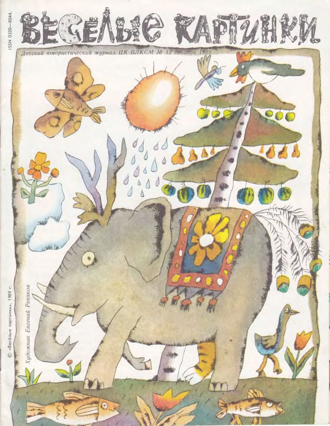 Ну а закончились перестроечные 80-е в декабре 1989 года рогатым слоном с павлиньими перьями в заднице. Автор работы - художник Евгений Ревяков, который вскоре, как и большинство пригретых журналом современных художников, бросит книжную и журнальную графику и уйдет в живопись - выставляться и продаваться.