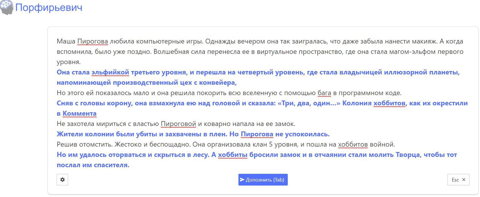 Автор: Владимир БрайтНейросеть «Порфирьевич»https://text.skynet.center/ — алгоритм GPT-2 компании OpenAI, обучили на русской прозе, затем написали веб-интерфейс и теперь любой желающий может получить связный текст на основе нескольких строк.