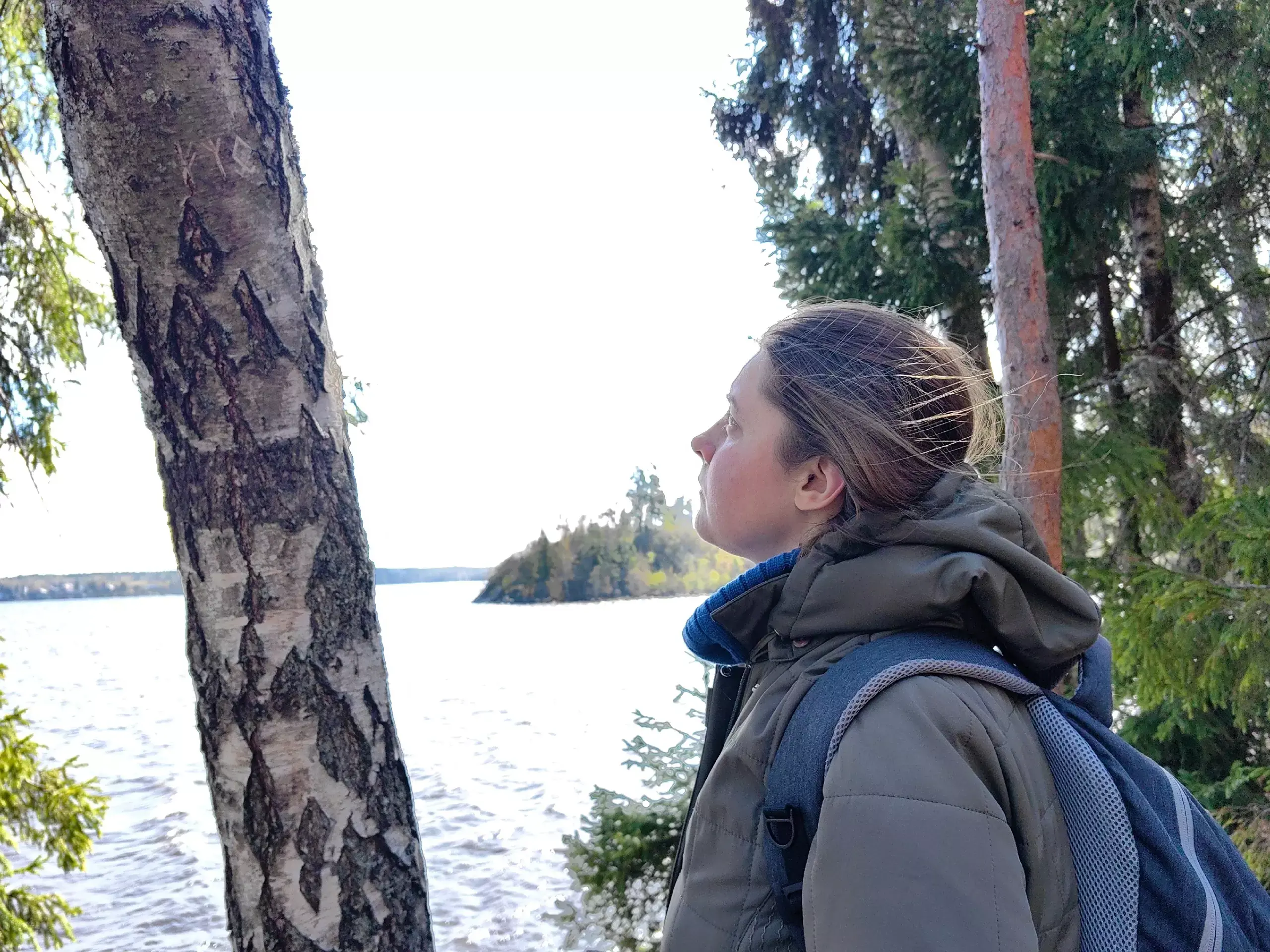 Мы рядом с пристанью на о. Сампо (ныне о. Былинный), остров не за нами, мы на него смотрим. На фоне именно острова нам не удалось сфотографироваться, солнце било в глаза.