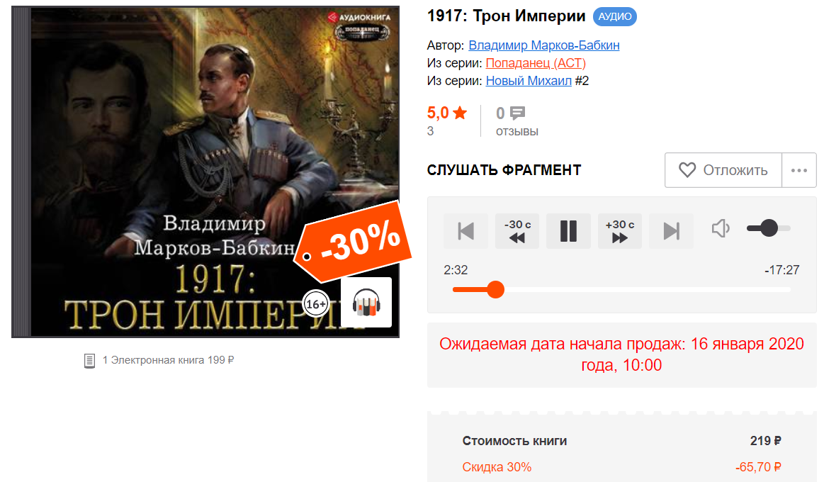 В порядке новостей - на ЛитРес начался предзаказ на аудикнигу второго тома цикла "Новый Михаил". Есть ознакомительный аудиофрагмент.